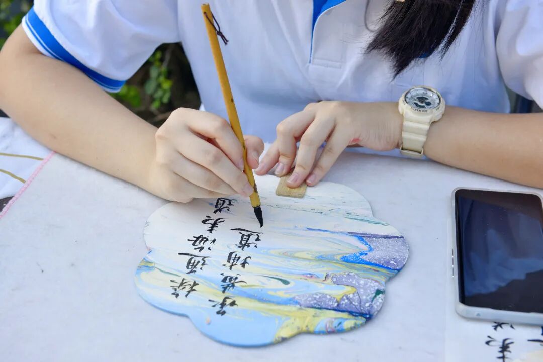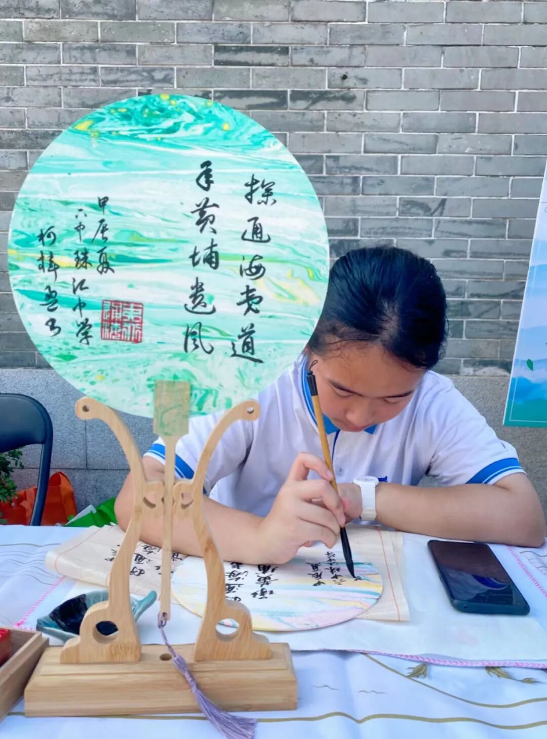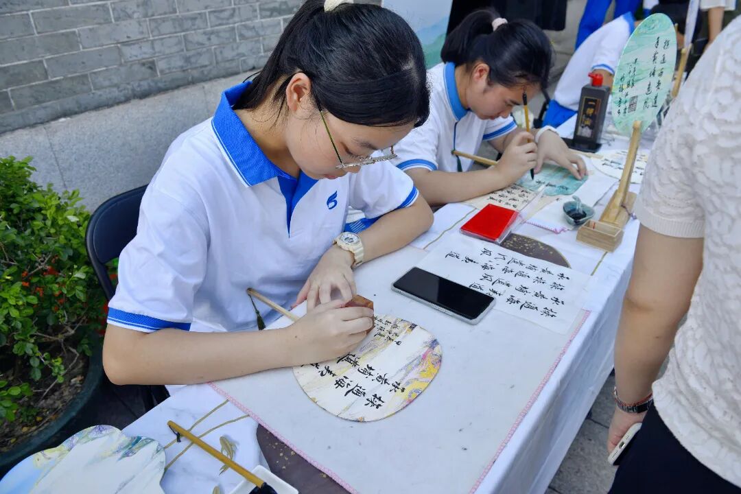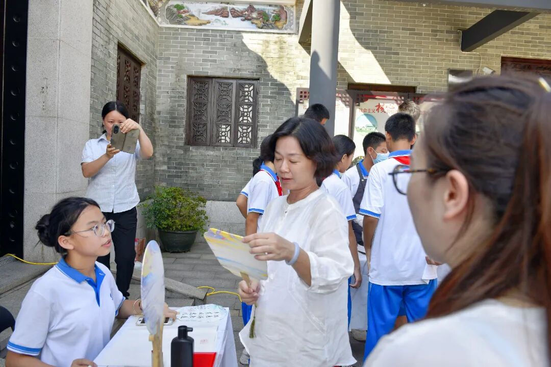 总结会后,嘉宾及师生在作品展示区观看了同学们的课程成果,并驻足在互动区的学生摊位,仔细欣赏漂漆扇书法、课程主题橡皮印章。墨香飘逸,韵致悠长,传统文化的魅力在同学们的指尖流淌。