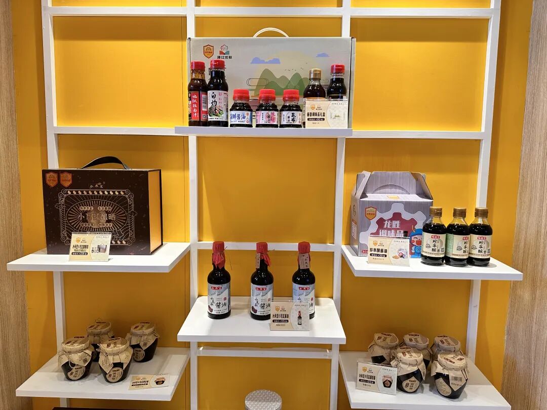 “江门开平优品馆”结合乡村振兴主题,深挖开平特色农产品,展出一百多款产品。走入店内,商品琳琅满目,南乳饼、酱油、健之源灵芝胶囊等各式商品整齐摆放,镇濠泥鸡造型独特,质感十足,靠一张牛皮纸连接,一拉一伸能发出“咯咯”的鸡叫声,参观者触摸产品就能感受到满满侨乡特色。