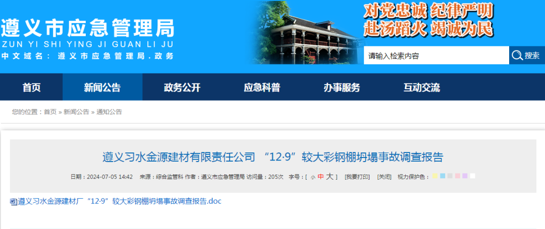 《遵义习水金源建材有限责任公司 “12·9”较大彩钢棚坍塌事故调查报告》