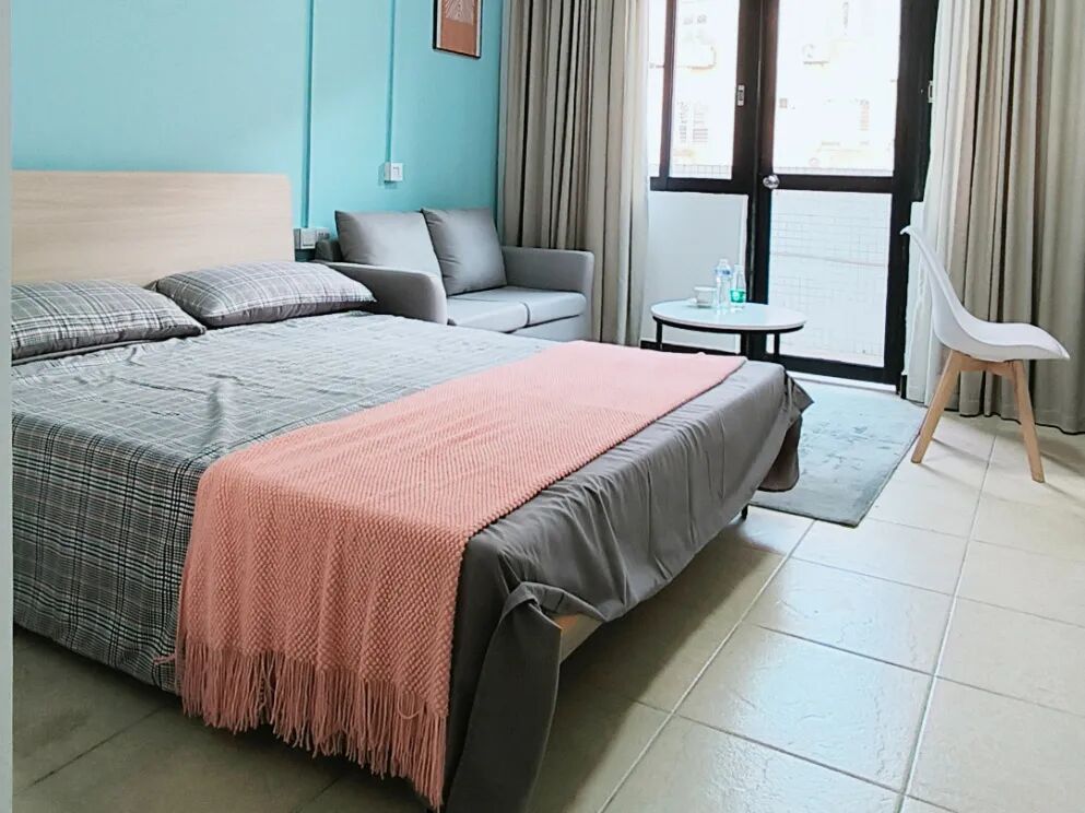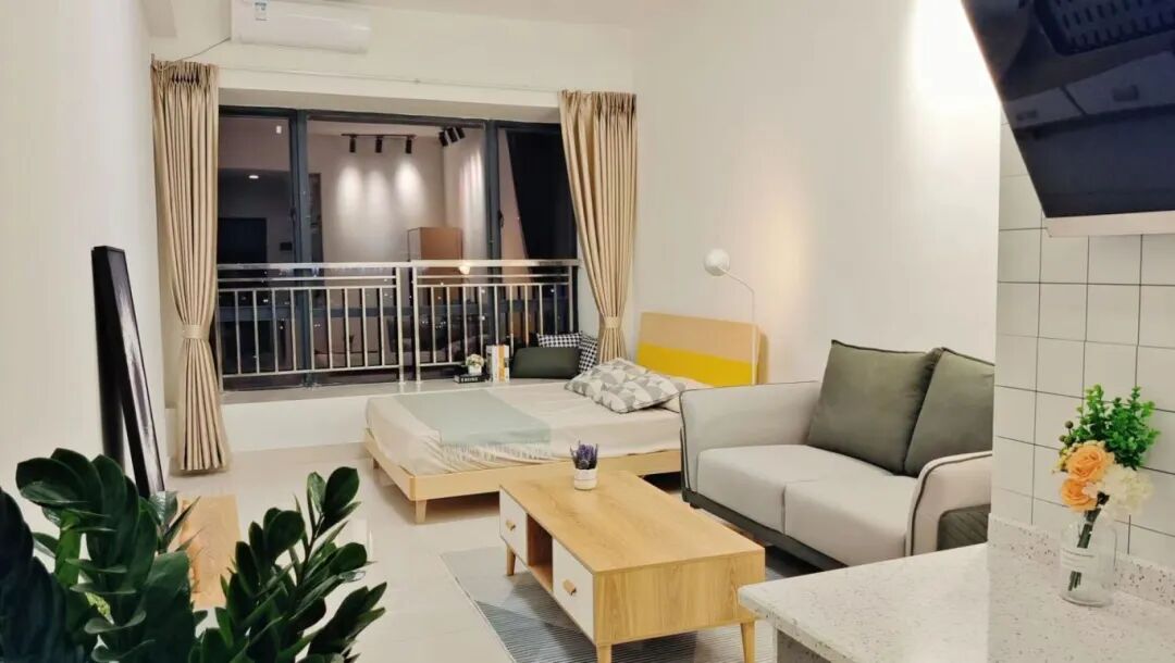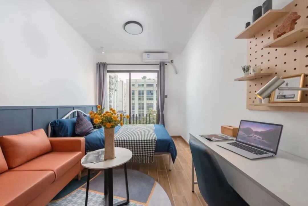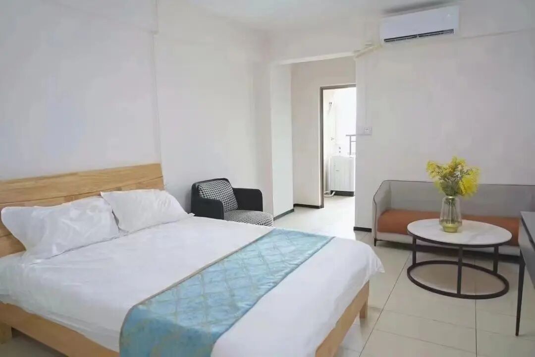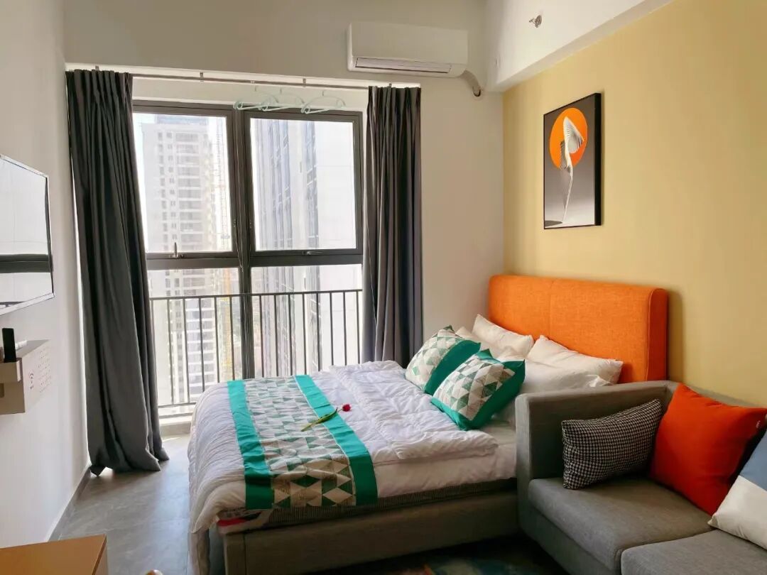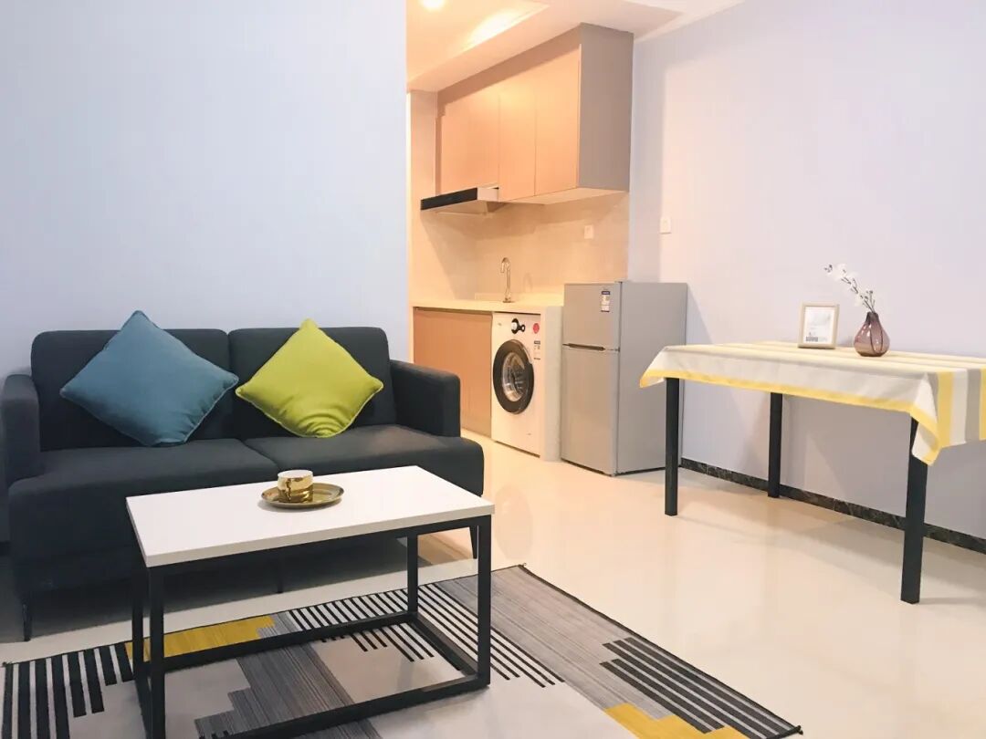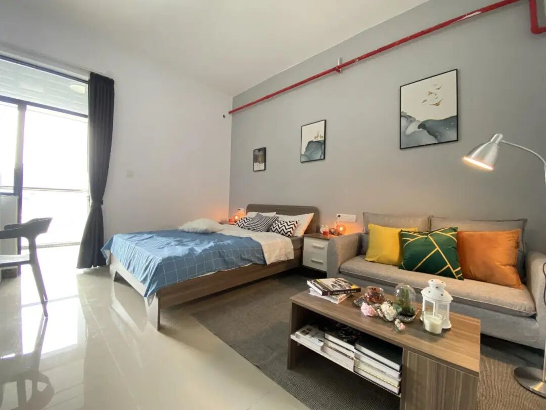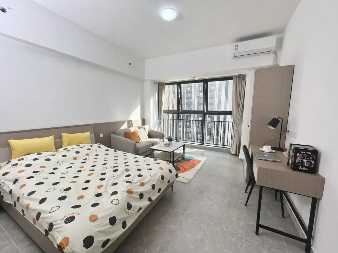 房间配置:配备沙发,桌椅,床,空调,洗衣机,冰箱,抽油烟机、热水器,智能门锁,独立阳台,卫浴,WIFI。