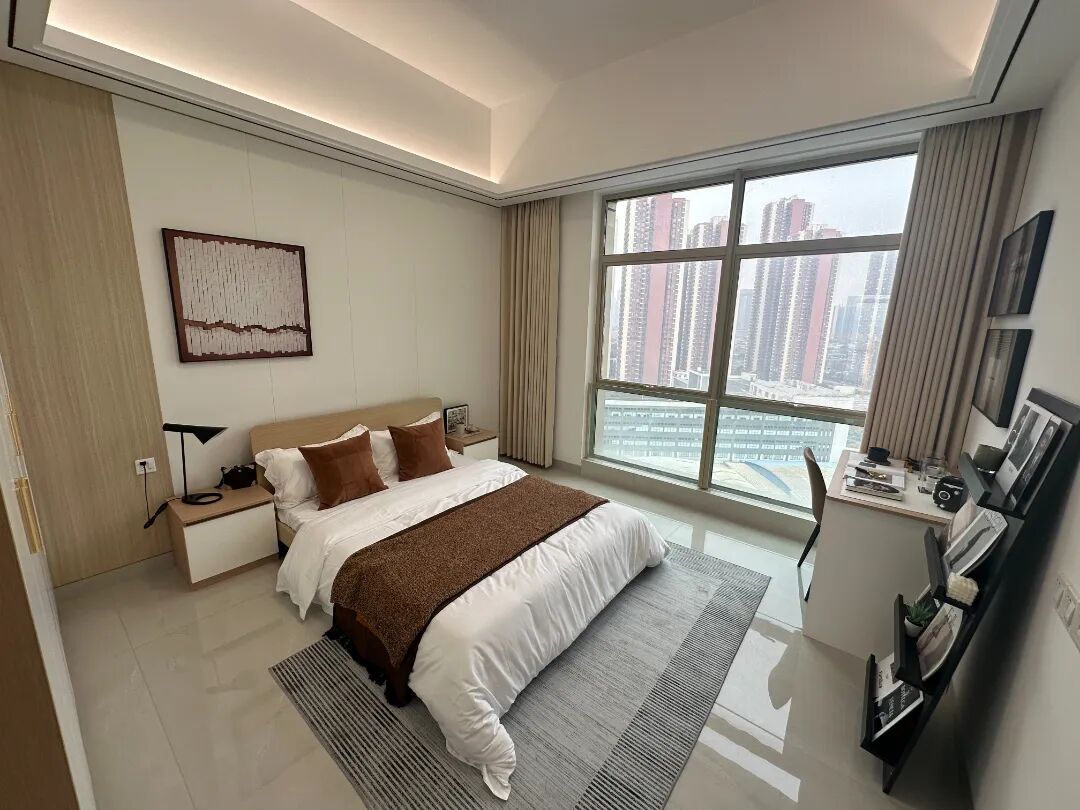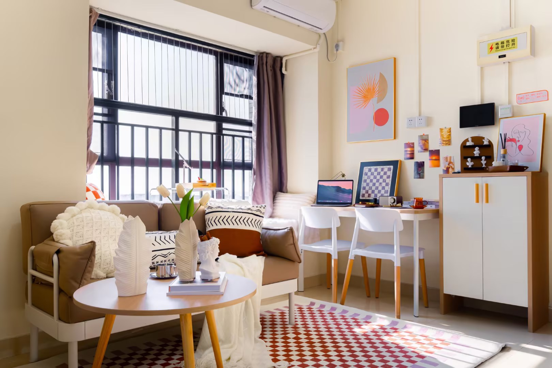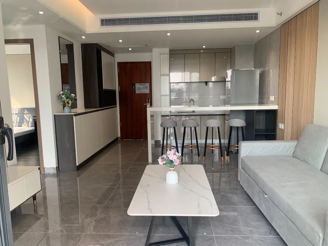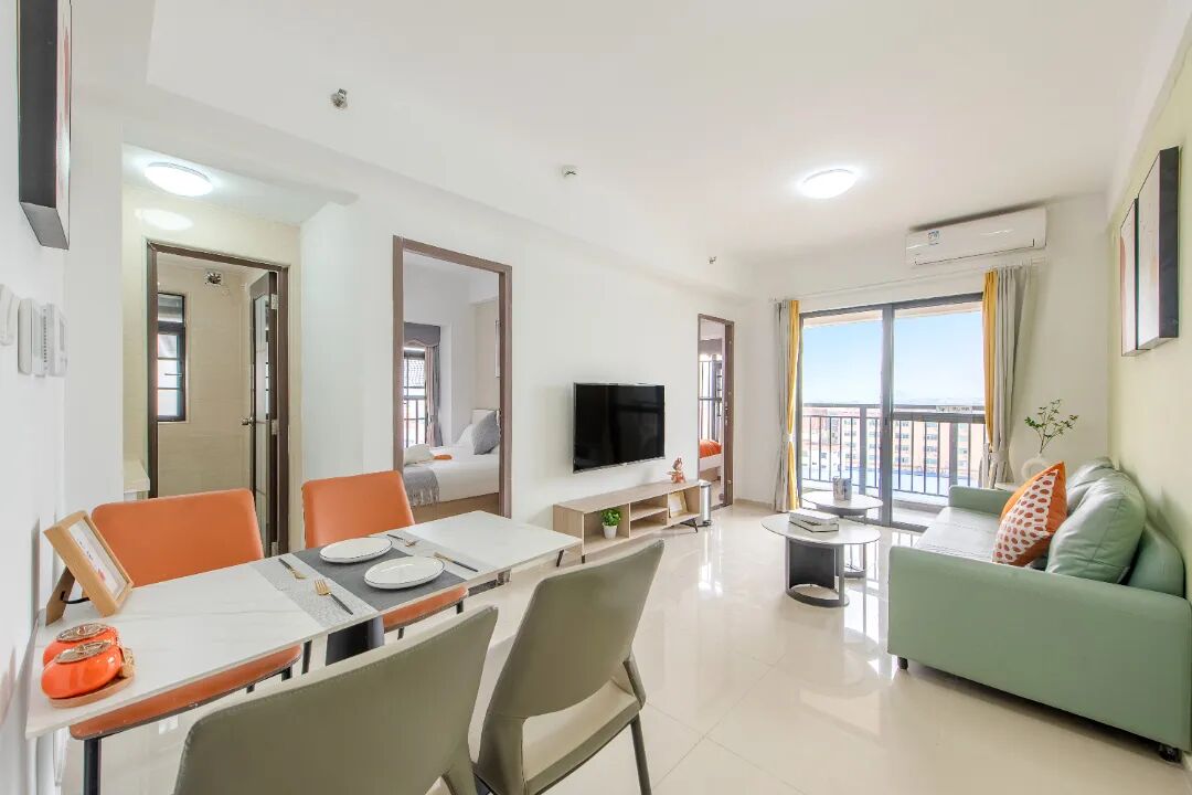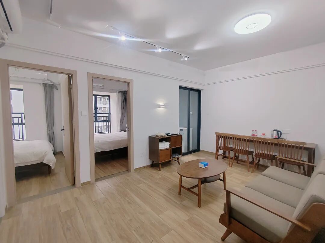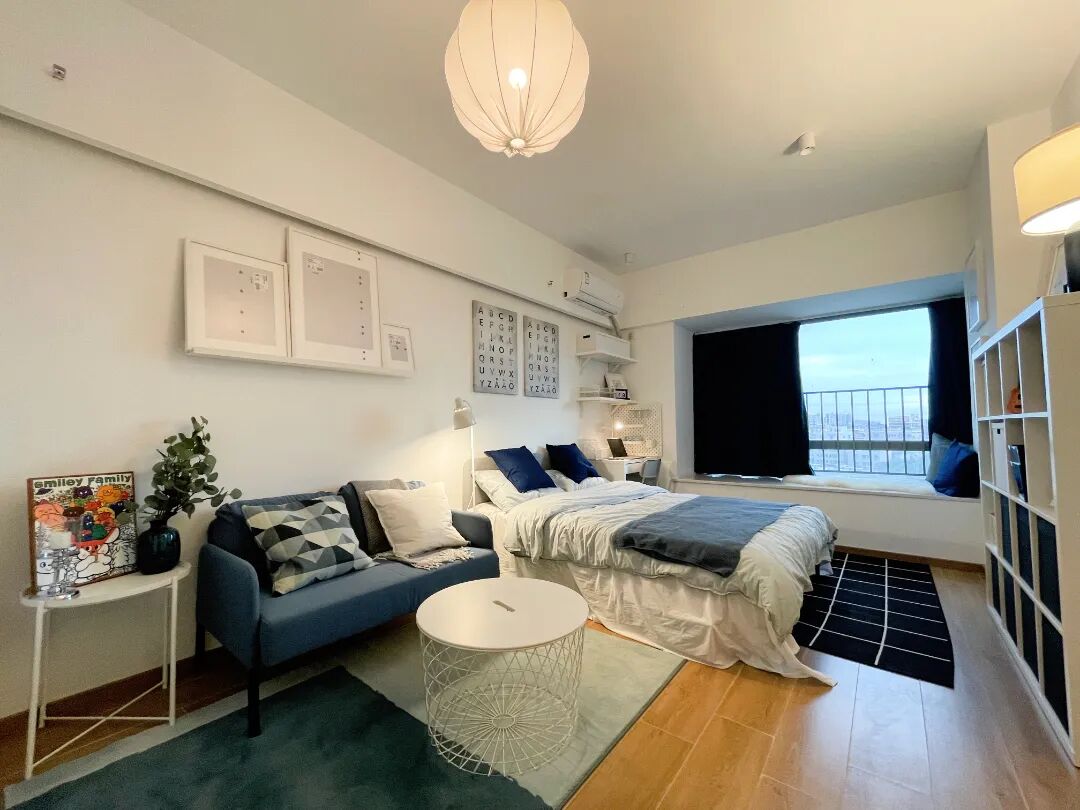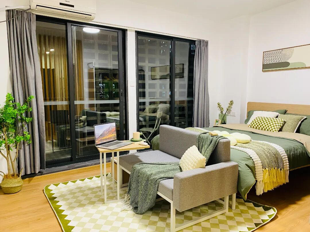 房间配置:配备沙发,桌椅,床,空调,洗衣机,冰箱,抽油烟机、热水器,智能门锁,独立阳台,卫浴,WIFI。
