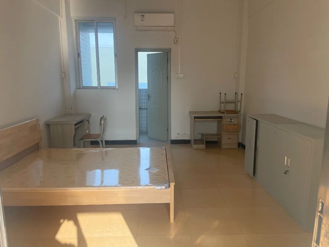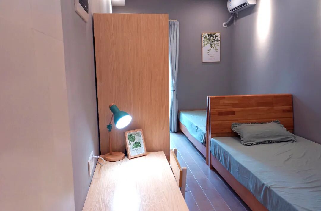 单人间配置:1.5大床1张、衣柜2个、书桌2张、椅子2张、TCL空调1台、美的电热水器50升1台。