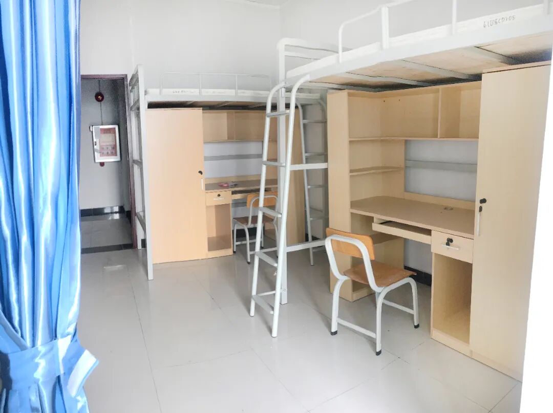 四人间配置:上下铺2张、衣柜4个、书桌4张、椅子4张、TCL空调1台、美的电热水器50升1台。
