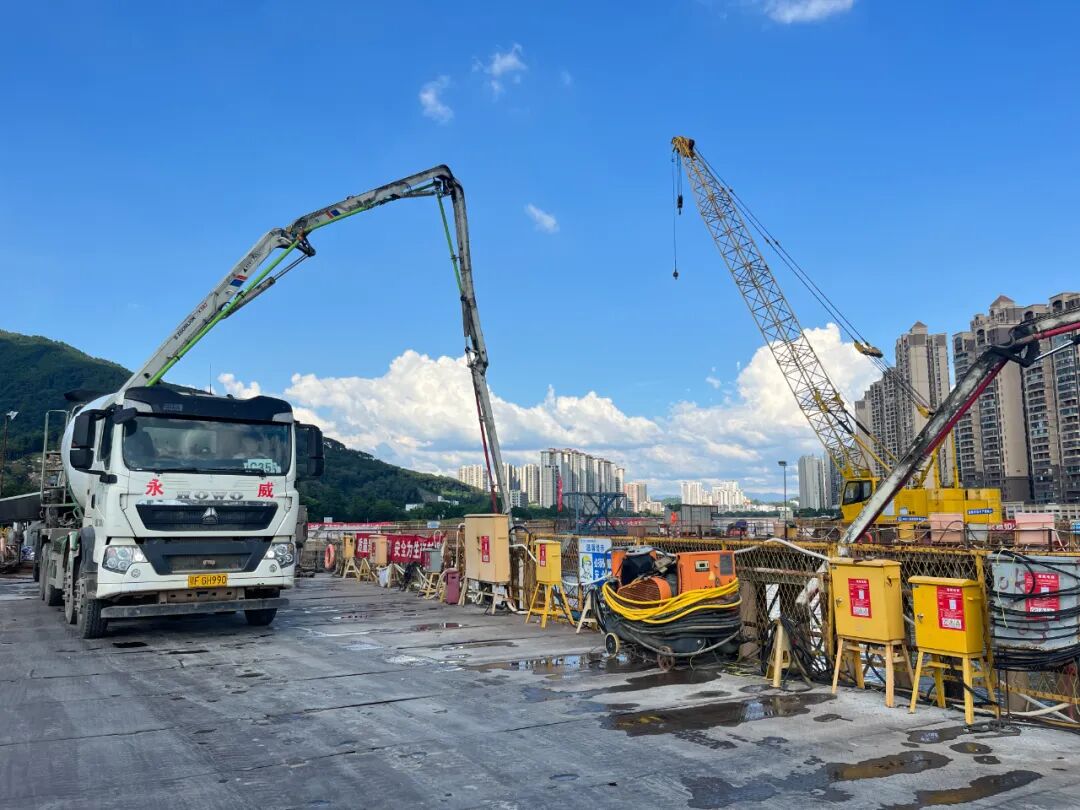 记者在现场看到,一辆辆混凝土罐车来来往往,穿梭不停,一派繁忙景象。施工人员正在对水中4# 主桥墩进行混凝土浇筑,记者了解到,混凝土浇筑需要连续施工12小时,预计7月18日凌晨完成浇筑作业。