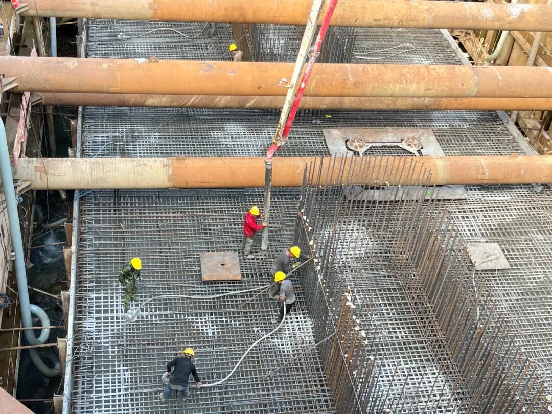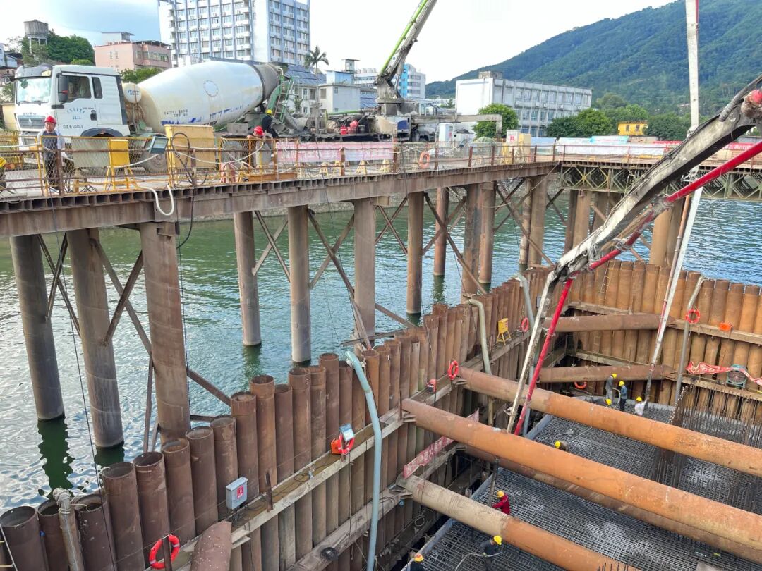 此次浇筑的4#承台长28.6米,宽14.6米,高度4.5米,设计浇筑混凝土方量1879立方米,分两次浇筑。“此次浇筑涉及大体积混凝土施工,对施工质量提出了更高要求。”中铁七局丹霞大桥项目施工负责人郭航行表示,4#主墩承台在施工过程中面临了极为复杂的地质挑战,围堰内外溶槽和溶洞相互贯通,承台基坑开挖过程中基坑内涌水量大,给承台的施工带来了极大的困难。尤其今年四月份以来,韶关地区遭遇了极端暴雨天气,大桥施工经历了多次洪峰考验,洪水淹过水中钢围堰,导致施工工作延后约1个月。