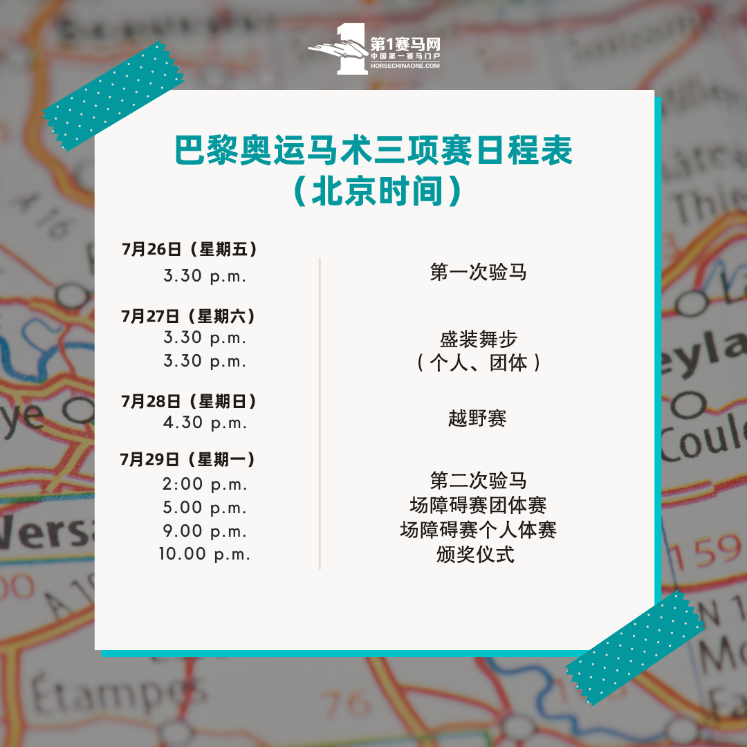 根据赛事日程安排,三项赛将于7月26日(星期五)当地时间上午9:30/中国北京时间15:30 开始,进行第一次马匹检查。