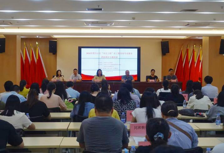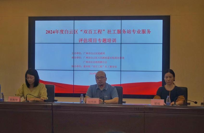 为有效指导白云区“双百工程”社工服务站(以下简称社工站)在服务过程中实现“站—片—点”的协调运作和管理,进一步在政策解读和实务培训等方面予以支持,结合广州市社会组织联合会(以下简称广州社联)承接的2024年度白云区社工服务站专业评估项目安排,2024年7月17日上午,由白云区民政局主办,广州社联和白云区人民政府嘉禾街道办事处承办,嘉禾街“双百工程”社工站协办的2024年度白云区“双百工程”社工站专业服务评估项目专题培训会在广州市白云区嘉禾街党群服务中心举行。白云区民政局党组成员、副局长何伟林,白云区嘉禾街道办事处副主任郭海华,白云区民政局社区服务中心负责人梁琼,白云区嘉禾街道办事处公服务办主任张国威出席培训,50余名白云区各镇(街)“双百工程”社工站负责人及社工参加培训会,本次培训会由广州社联常务副秘书长庄秀英主持。