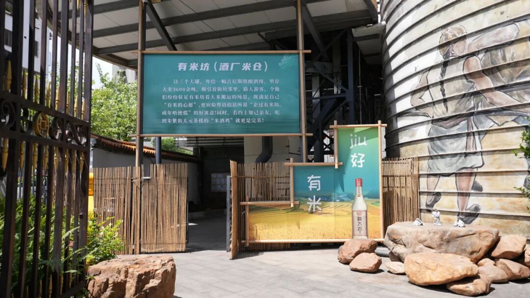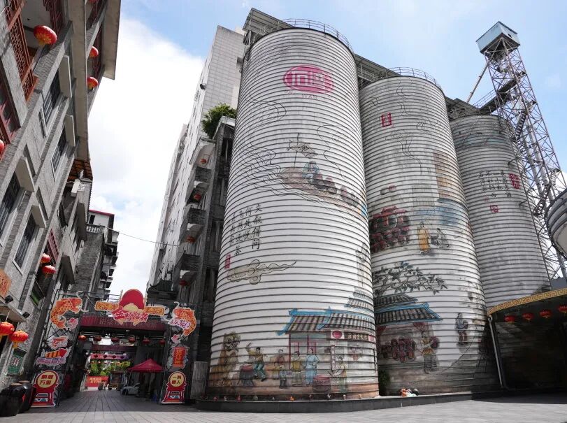 走进朱紫街,首先映入眼帘的是三个彩绘大米罐,大米罐高达30米,直径10米,总体彩绘面积达1500平方米,每个米罐可装1200吨大米,作为国内最大的大米储罐彩绘工程,成为朱紫街建设成为岭南酒文化朝圣之地的点睛之笔。