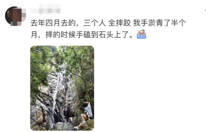 记者在社交平台上搜索“大岭山森林公园网红瀑布”还发现不少来打过卡的游客表示“危险,不适合去”,有人去年三个人去了这里,在路上全摔跤了,摔的时候手还磕到石头上,手淤青了半个月。