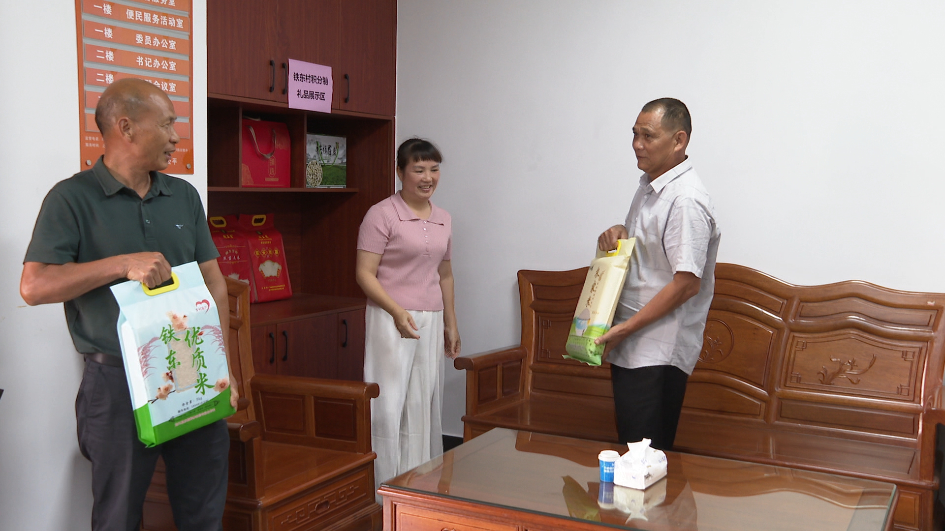 在铁场镇铁东村,用积分兑换的奖品把柜台摆得满满当当,每一位村民都可以通过参与村里各项治理工作来赚取积分兑换奖品。这不,村民黄和泰、黄福平就通过自己的积分兑换,从村干部手中接过奖品。拿到自己心仪的奖品,他们俩的脸上都露出欣喜的笑容。“积分制对我们影响深刻,以前大家比较不注重环境卫生,现在周边的环境好了,大家更积极参与这些活动,打扫庭院之类的,现在大家都很自觉。”铁场镇铁东村村民黄福平说道。