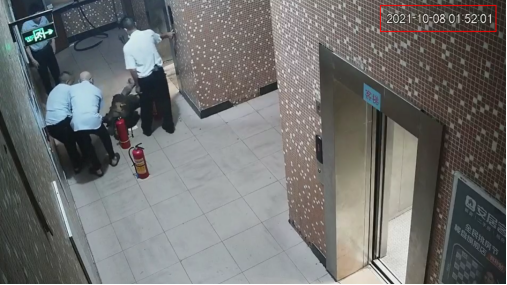 8日1时50分49秒,四名男子用灭火器对南侧货梯内部实施处置,1时51分55秒,两名男子将伤者拉出电梯轿厢。