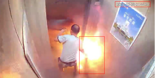 视频监控录像显示2021年10月8日1时36分许一男子右手拎着一银色外壳的电池进入电梯,约10秒后电池冒烟然后电池爆燃,火光瞬间铺满整个轿厢。