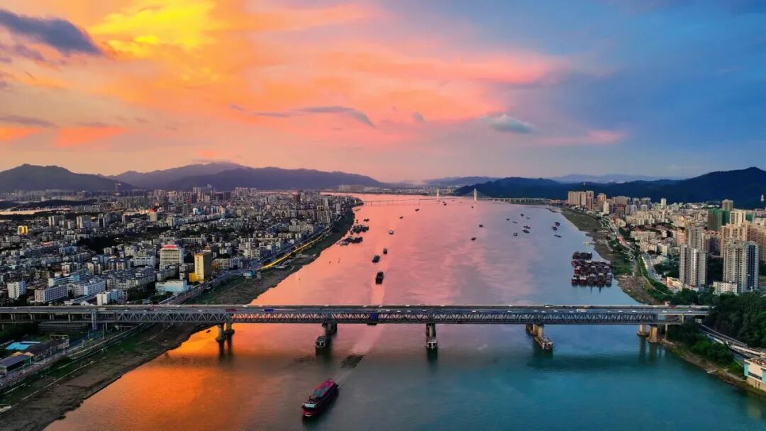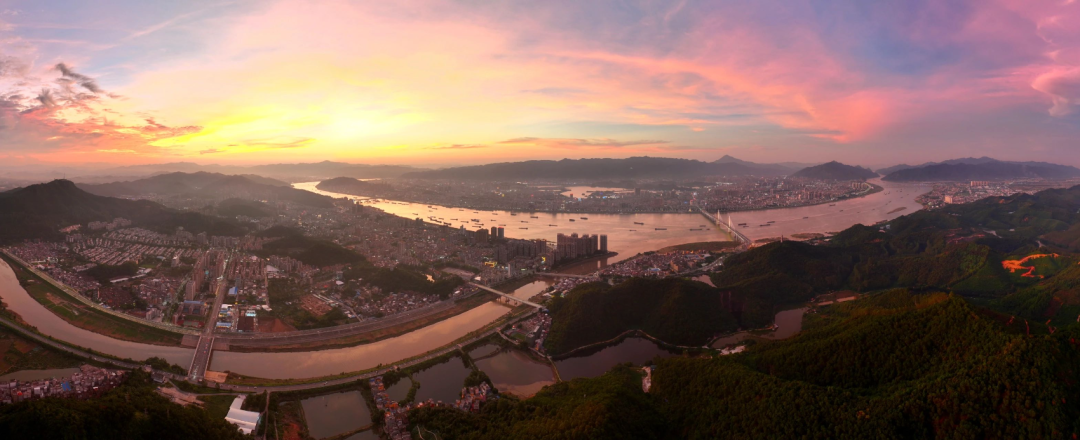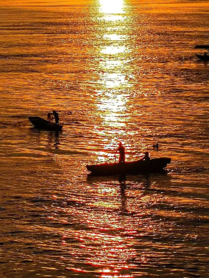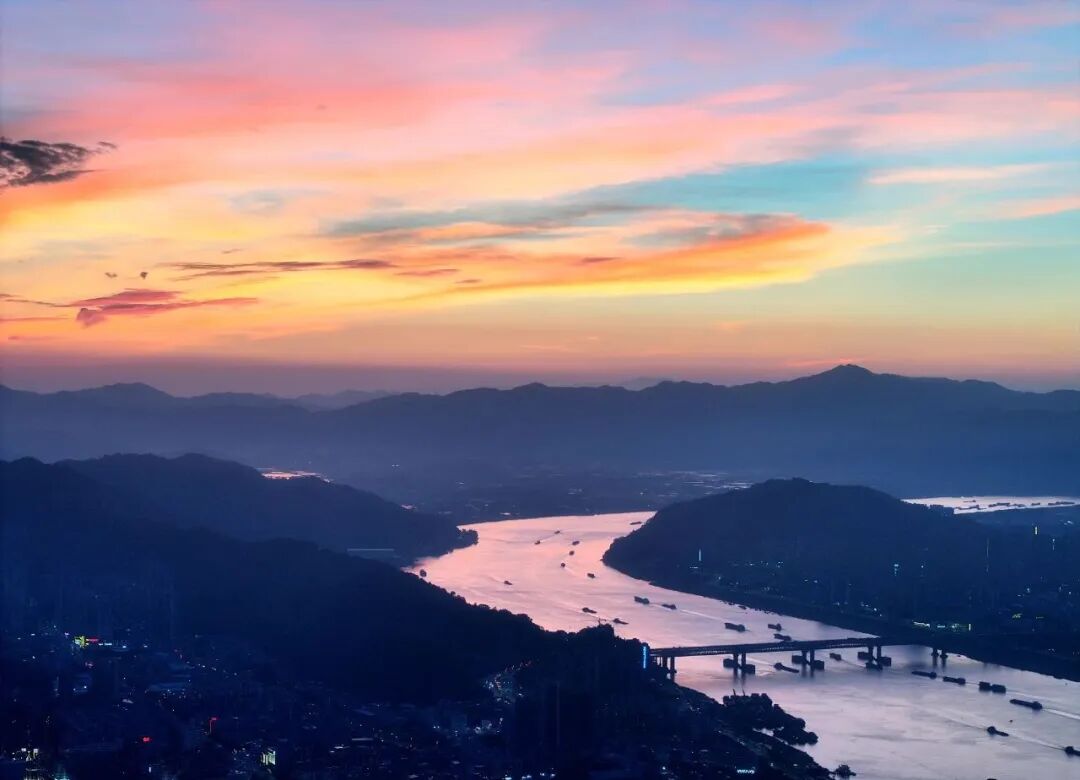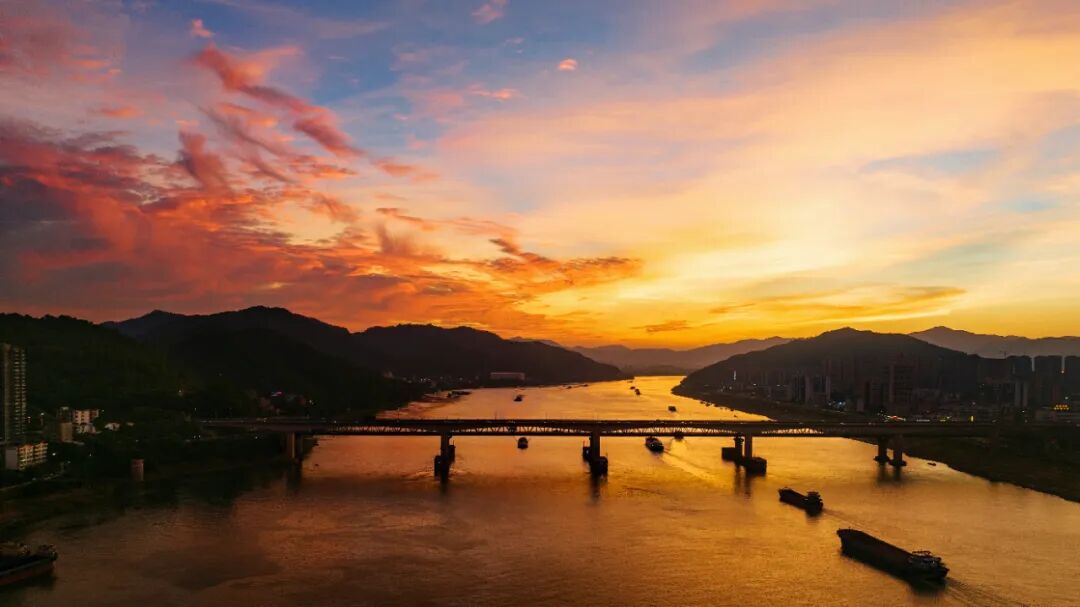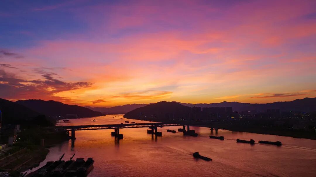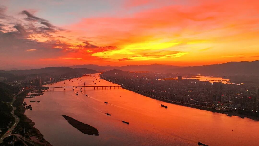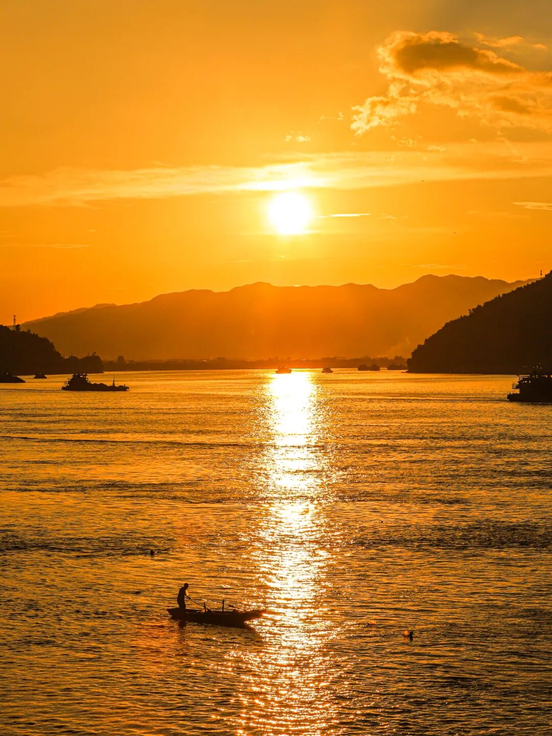 “余晖照耀金波里,诗意满怀情正浓。”橘色暖霞穿过云层,铺满天边,洒落江面、波光粼粼,水天一色、浮光跃金的绝美景致让人沉醉!夕阳、船儿、青山……这就是家门口的诗和远方。
