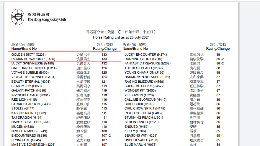 7月25日,香港马会在其官网发布2024年季终马匹评分总表。现役评100分或以上马匹数目,共31驹,曾胜一级赛评120分或以上马匹仅7匹。