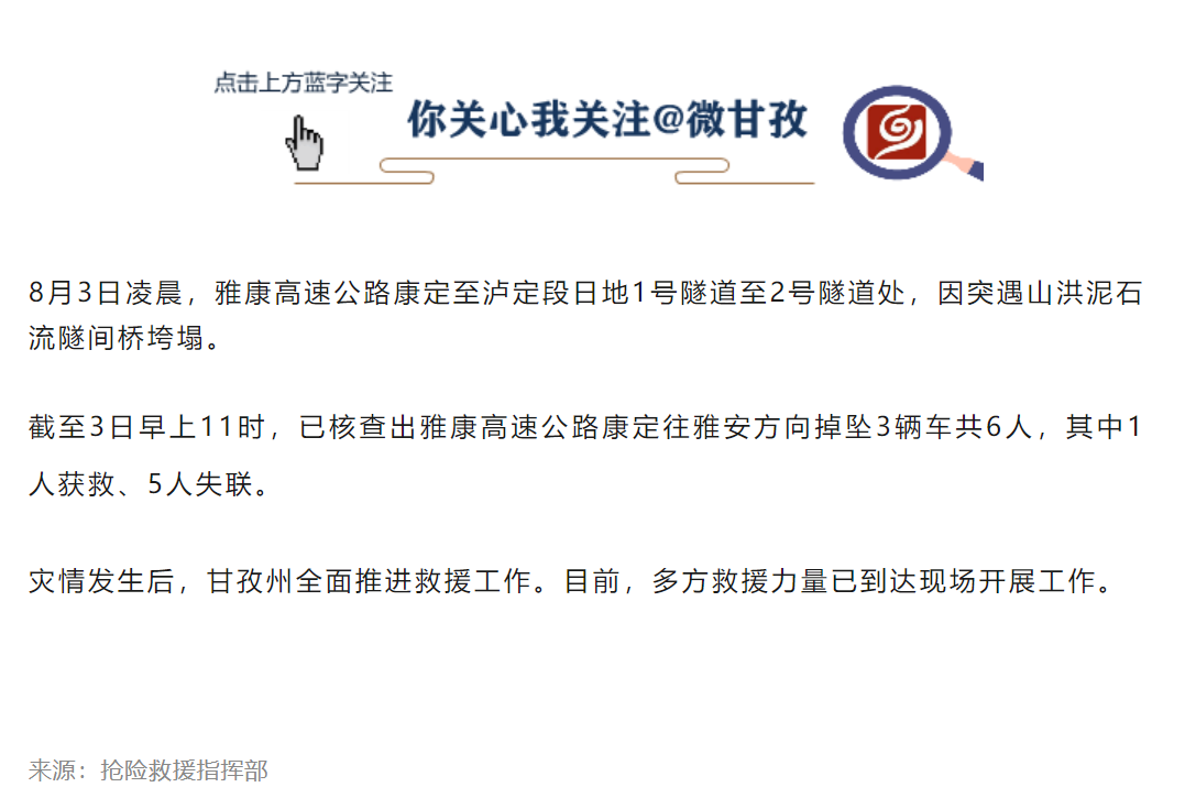 截至3日早上11时,已核查出雅康高速公路康定往雅安方向掉坠3辆车共6人,其中1人获救、5人失联。