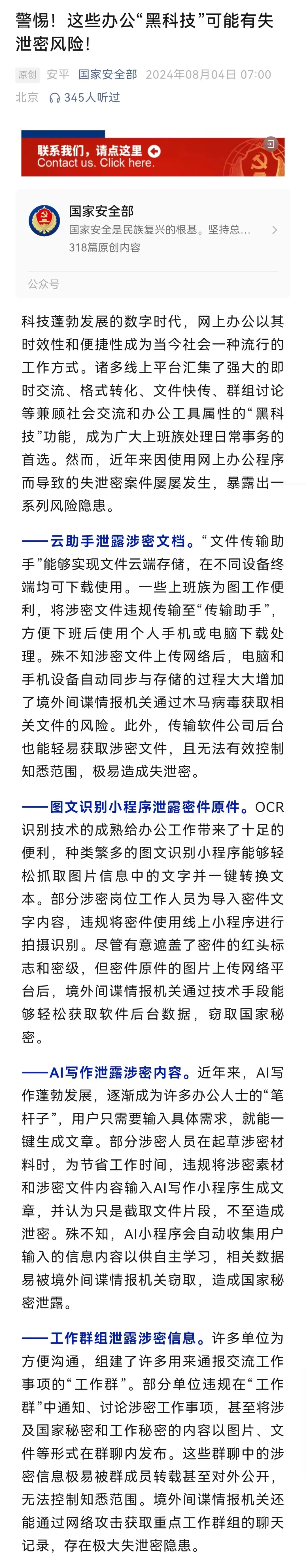 文件传输助手、图文识别小程序、AI写作……如今,诸多线上平台汇集了强大的即时交流、格式转化、文件快传、群组讨论等“黑科技”功能。然而,近年来因使用网上办公程序而导致的失泄密案件屡屡发生。8月4日,国家安全部微信发布提醒,这些办公“黑科技”可能造成泄密风险。