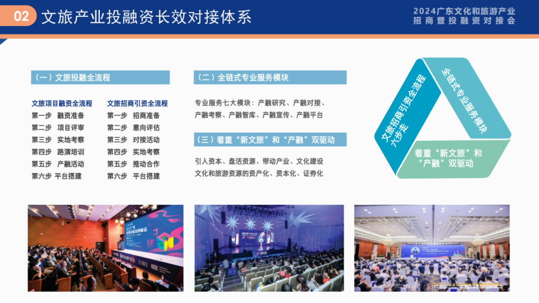 二是进入文旅产业投融资长效对接体系,针对有需求的项目或政府方在全年提供项目融资或招商引资的全流程服务,包括产融研究、产融对接、产融考察、产融智库、产融宣传、产融平台等七大模块组成的全链式专业服务。