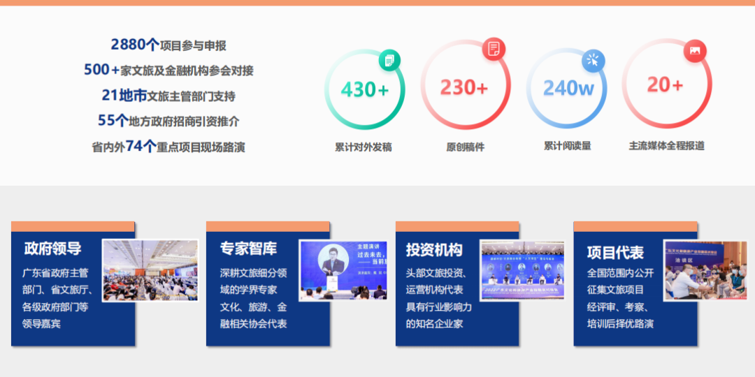 广东文化和旅游产业招商暨投融资对接会是广东省自2017年开始打造的文旅产融对接平台,举办七年来全国累计共有2880个项目参与申报,各类投资机构超500家参会对接,55个地方政府部门参与招展引资推介,74个重点项目进行现场路演,已经成为文旅产业招商引资的重要窗口,有力推动了广东与全国文旅产业领域交流和投融资合作。