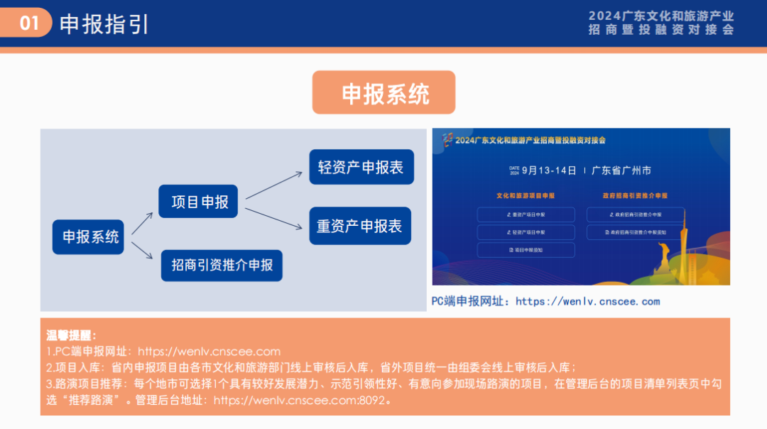 自6月开启对接会项目征集以来,全国各地积极申报,并由对接会组委会项目组陆续完成项目初审。本届对接会项目征集阶段将于8月8日结束,欢迎有招商引资意向,有资金或者产业链合作需求的文化和旅游项目方进入PC端网址