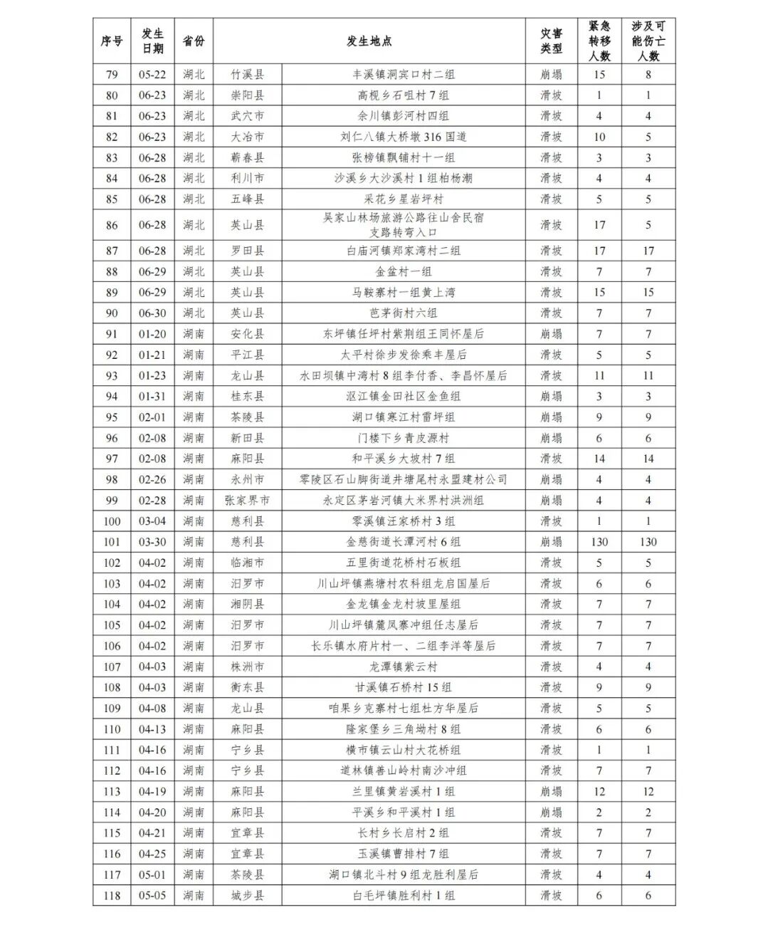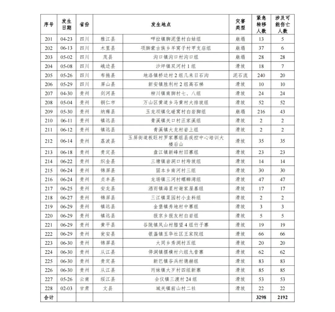 将今年1~6月各省份228起地质灾害