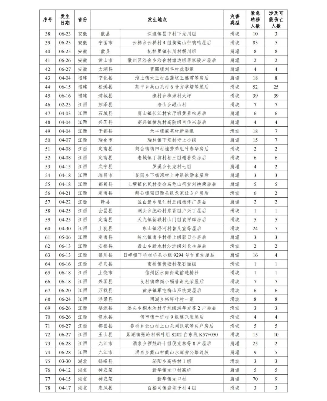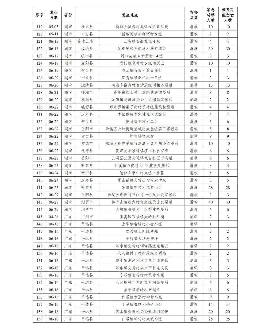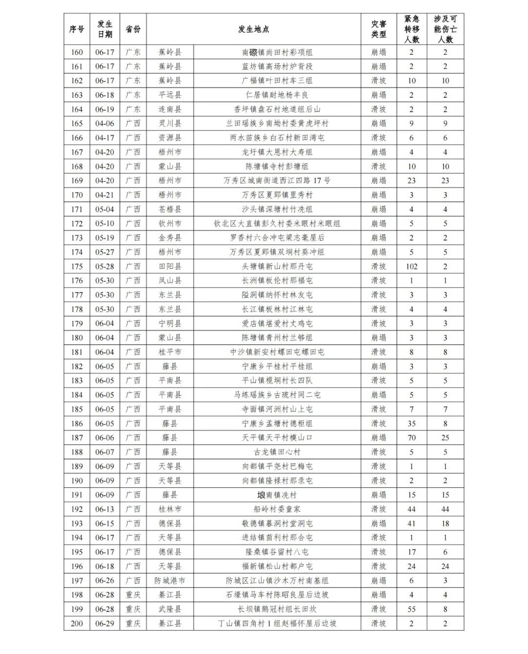 6月16日,广东省梅州市平远县仁居镇邹坊村大坑小组发生滑坡,因提前撤离受威胁住户25人,未造成人员伤亡。