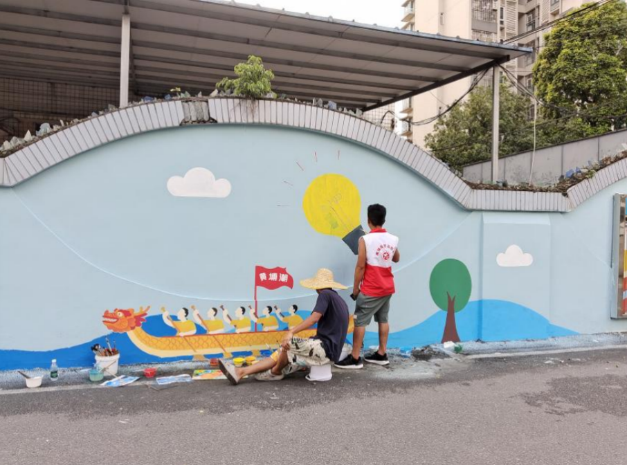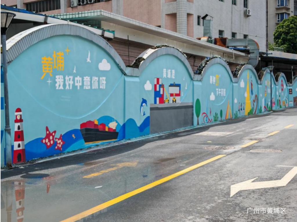 在充分收集民意后,黄埔街道团工委、金丽园社区联合团区委、区青年志愿者协会、向上青年志愿服务队、中建四局华南公司总承包分公司、丰乐北志愿驿站、文冲志愿驿站、爱帮志愿服务队等社区共建单位,开展了一场乡村美化主题活动,由志愿者们一笔一划,共同勾勒出一幅幅具有“港口历史风貌、黄埔现代气息和奉献友爱互助”等主题的墙绘作品,让这泛旧的墙体重获色彩的“新颜”。