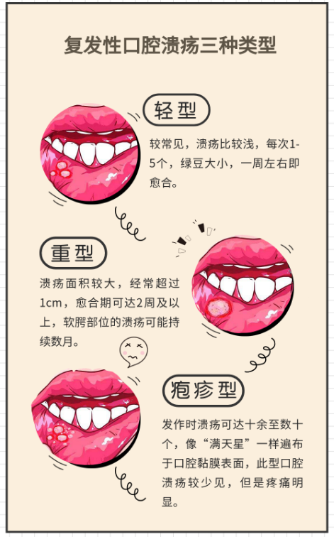 复发性口腔溃疡有三种类型,包括轻型、重型以及疱疹型。