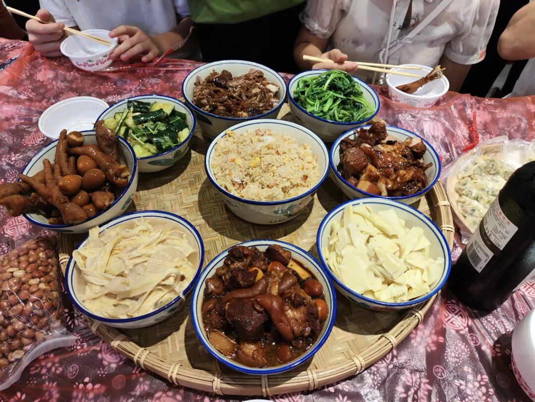 长桌宴是畲族特有的饮食文化,他们以大山为伴,在不断地探索下,形成了畲族独特的饮食风格。当天,参加活动的人员和村民们欢聚在一起,分工合作,一起制作畲族美食,亲身体验畲族文化的魅力。随着各色畲族特色美食陆续上桌,令人期待的畲族长桌宴便开始了,菜品十分丰富,都是畲族当地的美食。大家一边品味美食,一边听着村民分享畲族的习俗文化故事,在餐饮中感受民风,在菜肴中感受畲族情怀。