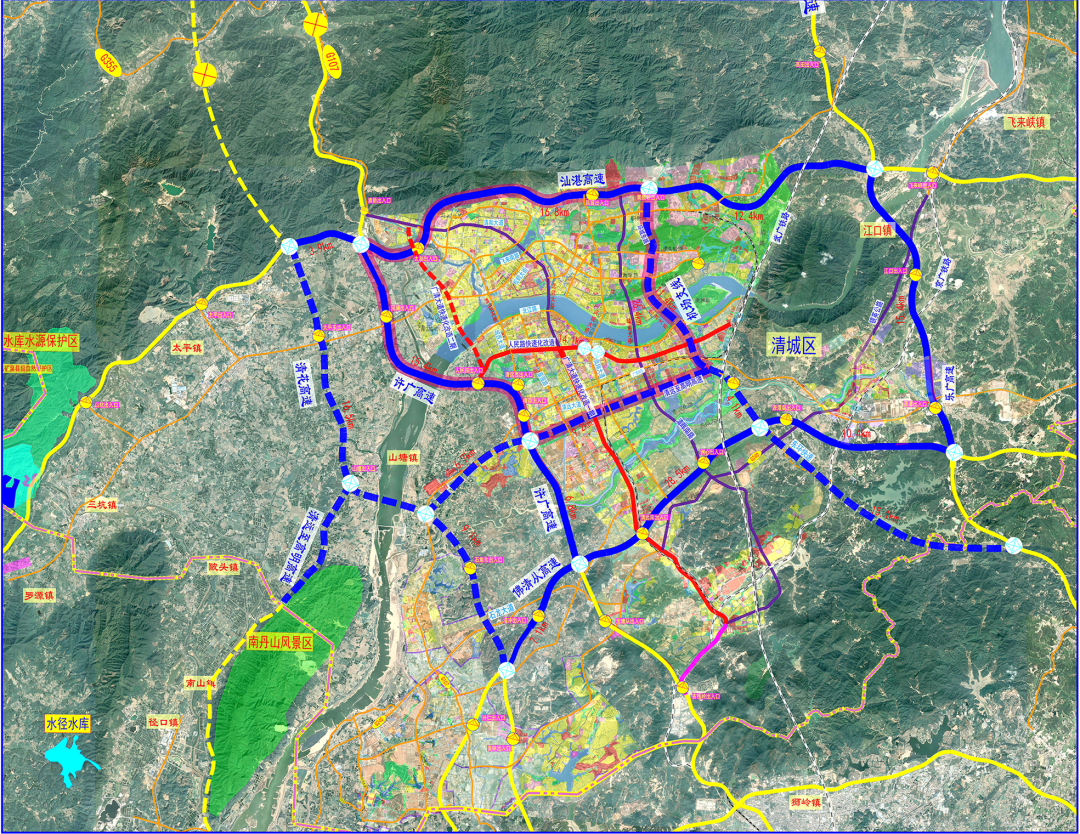 清远市中心城区环城高速公路示意图。记者12日从市交通运输局获悉,佛清从高速公路北段8月初全线开通收费运营后,由4条高速公路组成的中心城区环城高速公路全面建成。