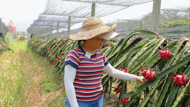 走进火龙果种植基地,只见火龙果树排列得整齐划一,厚肥翠绿的枝条上缀满了火红的果实,恰似一颗颗待人摘取的“红宝石”,惹人喜爱。