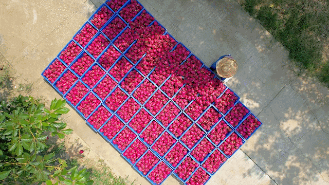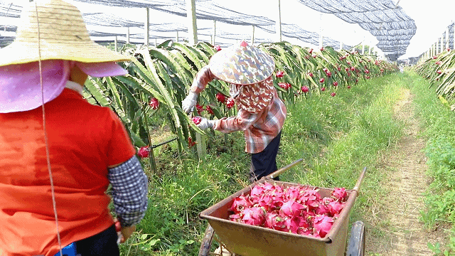 十多名工人正在基地里忙碌着,有人在采摘火龙果,有人在运输,一车车、一筐筐红红的果实让整个果园丰收感拉满。