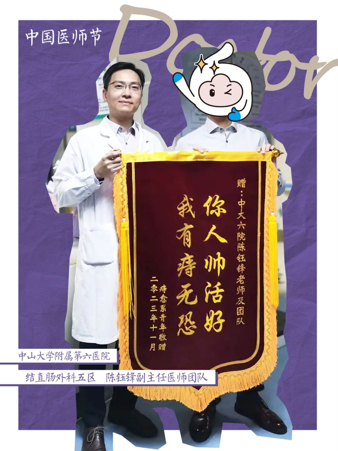 锦旗出自众多痔疮患者的代表之一小志(化名),他们受到多年的痔疮困扰,出血、脱出和疼痛成为他们如厕的梦魇,严重时坐立难安。我院结直肠外科五区陈钰锋副主任医师接诊后,详细地指导了生活方式和饮食调整,并给予相应的药物治疗后,小志的痔疮仍有反复发作,为此陈医生给小志进行了痔疮切除手术,并在手术后仔细地对小志进行宣教,交代后续以及生活中的注意事项,小志恢复良好,摆脱了困扰多时的难题,对诊治过程和治疗效果十分满意。