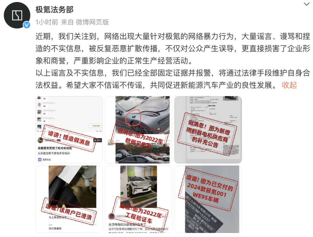 此前,@极氪法务部 还发布声明称网络上存在针对极氪最新汽车产品的不实信息以及网络暴力。
