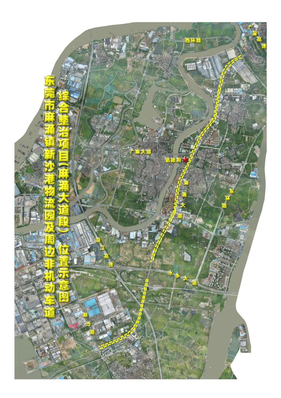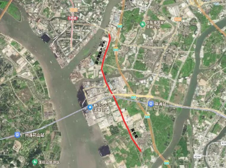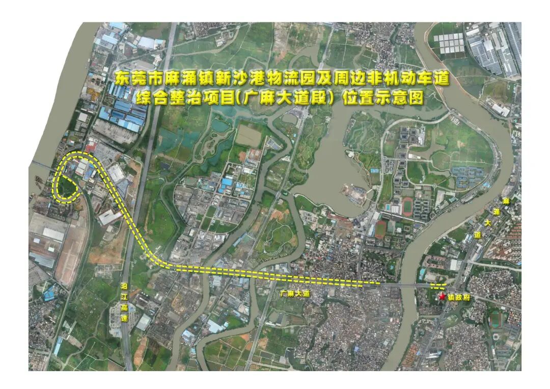 新沙路和水乡大道延长线段,位于新沙港物流园附近,新沙路道路为南北走向,起点(北端)连接水乡大道,终点(南端)连接麻涌大道;水乡大道延长线道路为南北走向,起点(北端)连接广麻大道,终点(南端)连接水乡大道;项目全长总计约6.48km。