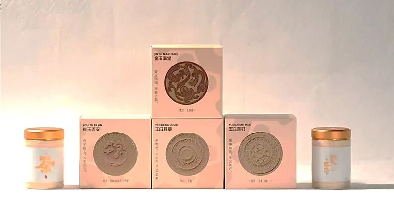 为满足广大消费者多样化需求,广东迎宾馆还研发了其它多款产品。礼盒设计灵感源自南越王博物院,外包装以西汉金釦象牙卮为设计灵感,采用了白金色为主色调,另搭配传统红色、米黄色,赋予礼盒高贵典雅之气息。四款月饼造型灵感来源于大玉璧、游龙涡纹玉璧、玉剑首、玉盒等文物的吉祥图腾图案,分别寓意“玉”见欢喜、有“玉”而安之意,搭配的文创杯垫以透雕游龙涡纹玉璧为设计灵感。