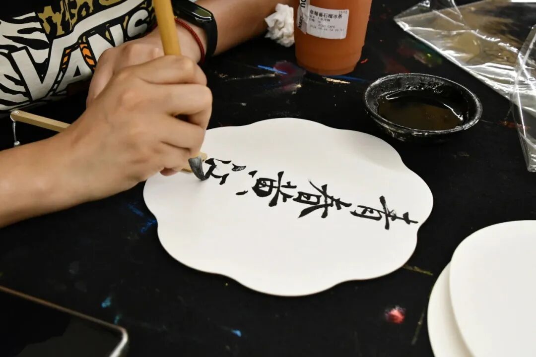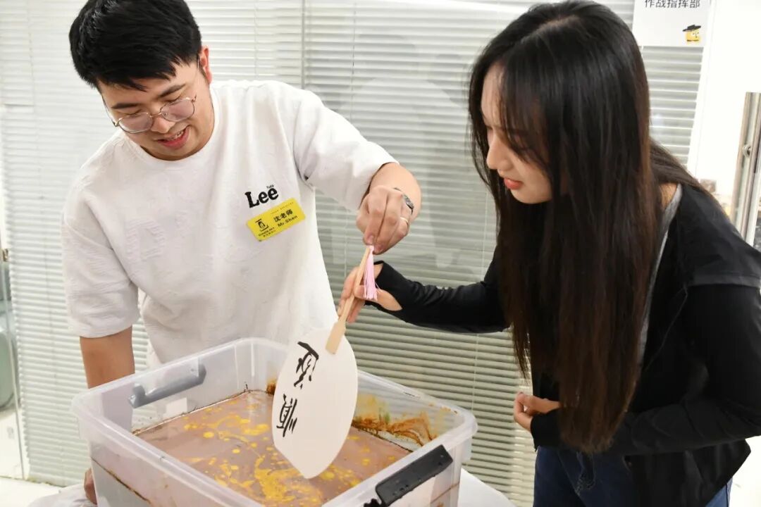 随后,大学生们小心翼翼地在扇子上写下自己的期盼,并在老师的指导下选取颜料、调色、浸水上色,用不同的色彩和丰富的想象力制作出属于自己独一无二的漆扇。
