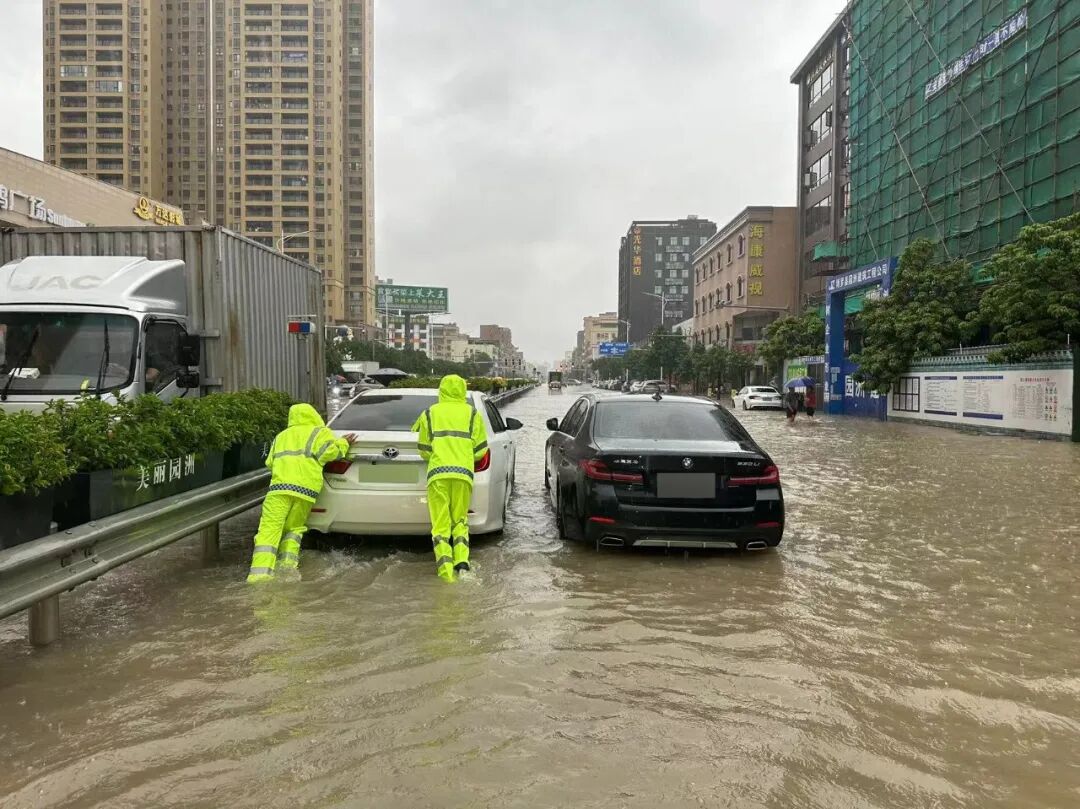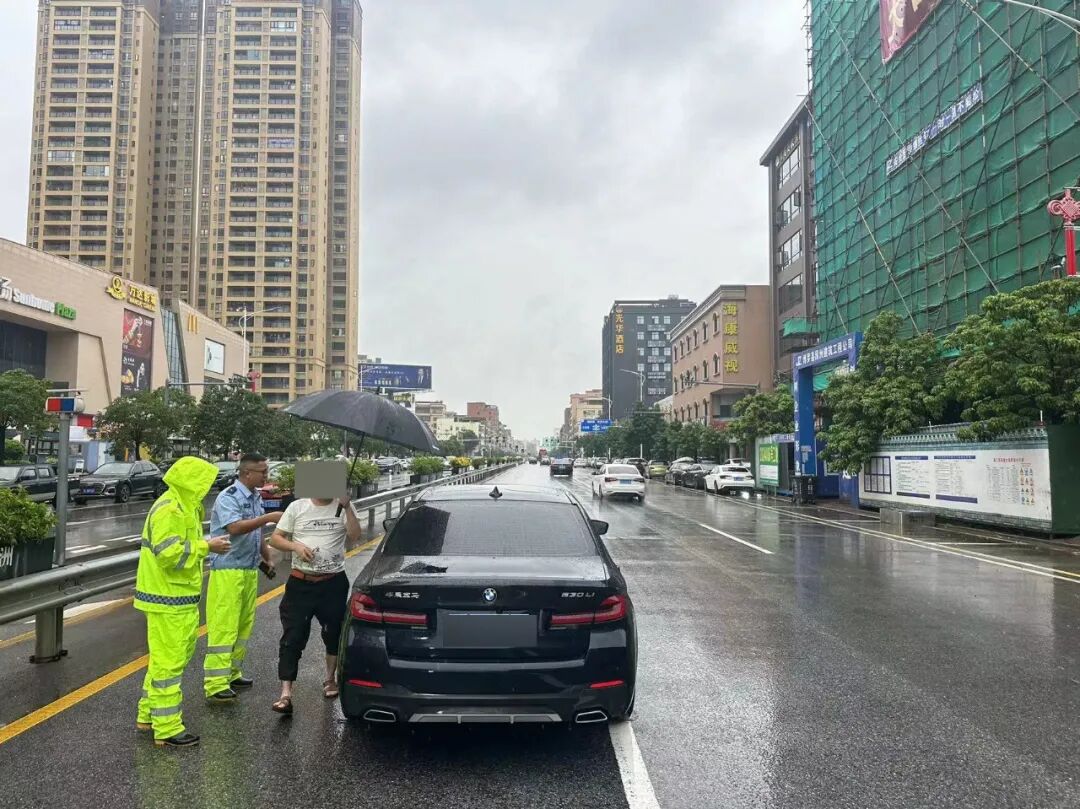 在福园路信鸿广场附近,园洲交警中队发现多辆汽车因暴雨导致进水短路,在路中抛锚,严重阻碍交通。面对紧急情况,交警立即上前,确认车辆状况后,不顾大雨倾盆,徒手将故障车辆逐一推移至安全地带,确保道路畅通无阻,同时积极联系附近修理厂为驾驶员提供后续救援服务。