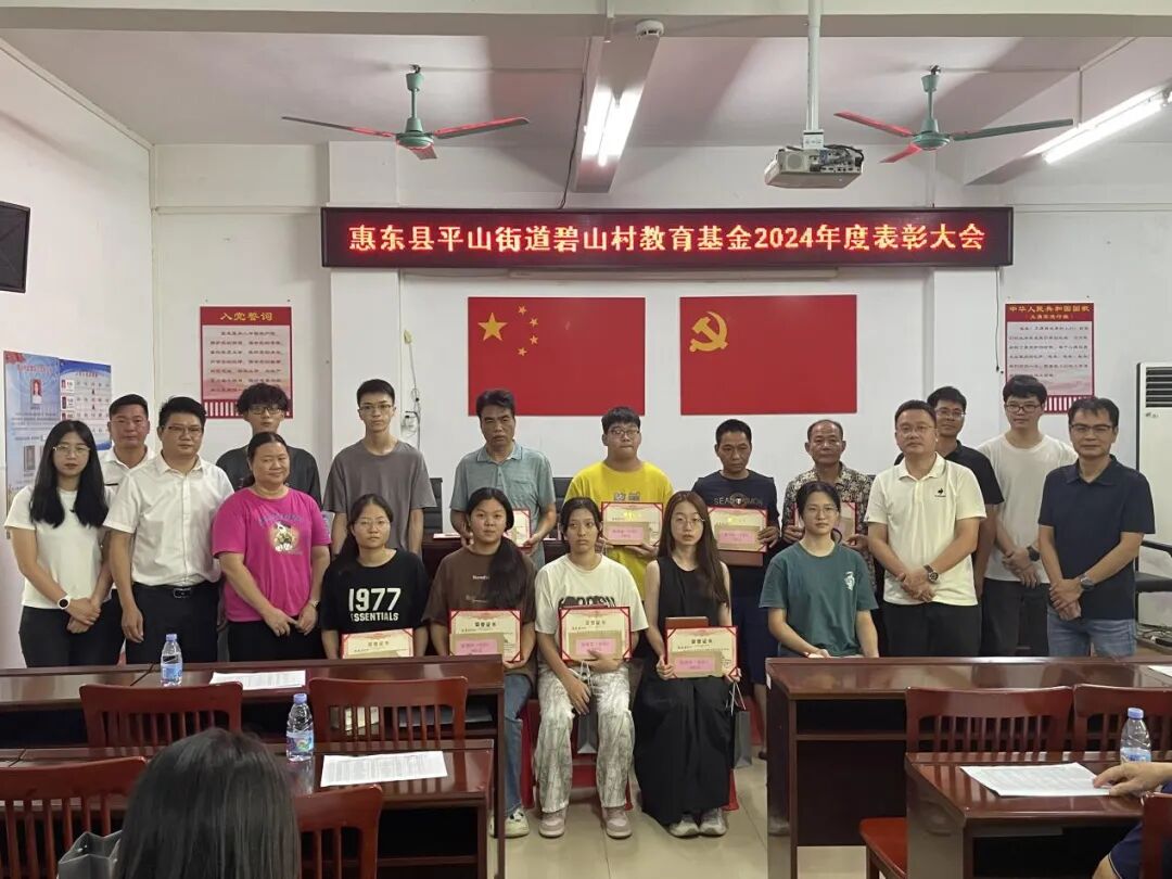 8月25日上午,惠东县平山街道碧山村召开了2024年度优秀学子表彰大会,向2024年度高考等各类学历升考与竞赛获奖的碧山籍优秀学子颁发奖学金。平山街道办驻村工作组、村“两委”干部、碧山教育基金理事成员及获奖学生与家长等共60余人员参加。