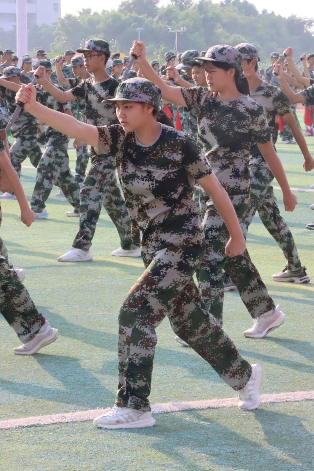 刺杀操是步兵传统的军中练兵项目,同学们精彩的刺杀操表演展示了他们七天刻苦训练的成果;匕首操方阵的表演极具视觉冲击力,同学们手持战斗匕首,以挺拔的身姿、统一的步伐,展现了他们的自信和坚强。