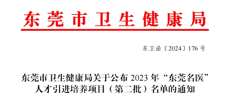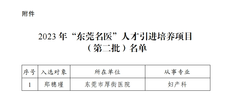 近日,东莞市卫生健康局公布 2023 年“东莞名医”人才引进培养项目(第二批)名单,我院妇产科主任、主任医师郑穗瑾入选2023年“东莞名医”人才引进培养项目的培养对象。