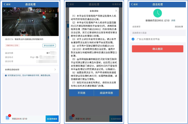 经查询如果有交通违法行为的,可以选择待处理违法记录后,点击【处理并缴款】,认真阅读违法处理业务须知并点击【阅读并同意】,进入待处理违法记录确认及缴款方式选择页面。选择合适的支付方式,完成支付后,处理完毕。