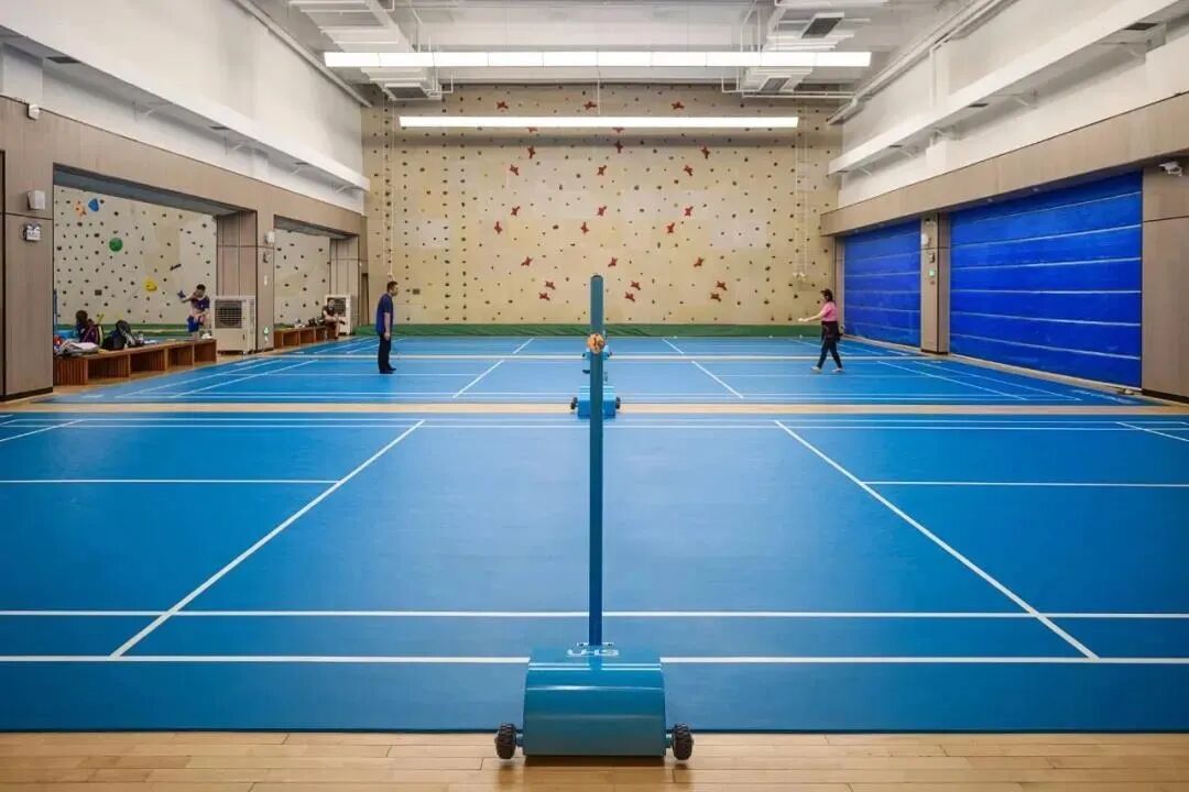 羽毛球馆共设有8块羽毛球场地,总占地面积1959㎡,底层采用俄罗斯进口的木地板,木地板上有一层天速地垫(世界羽联认证),有效的保护膝关节和裸关节。