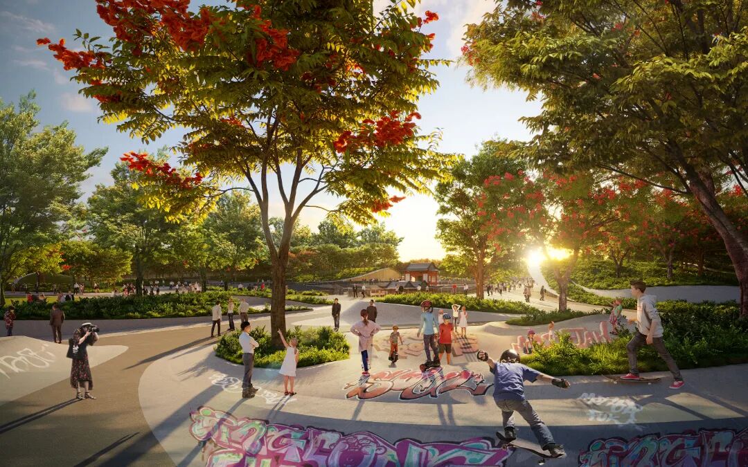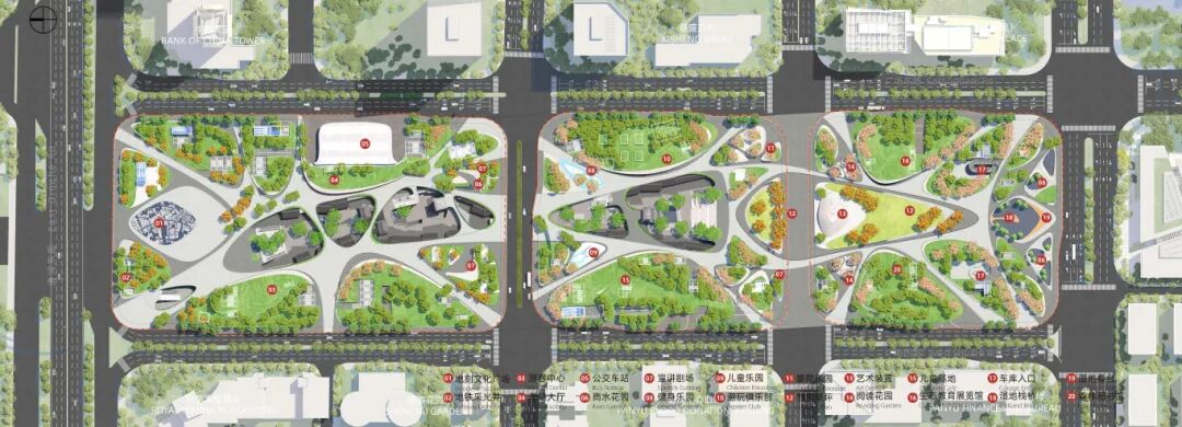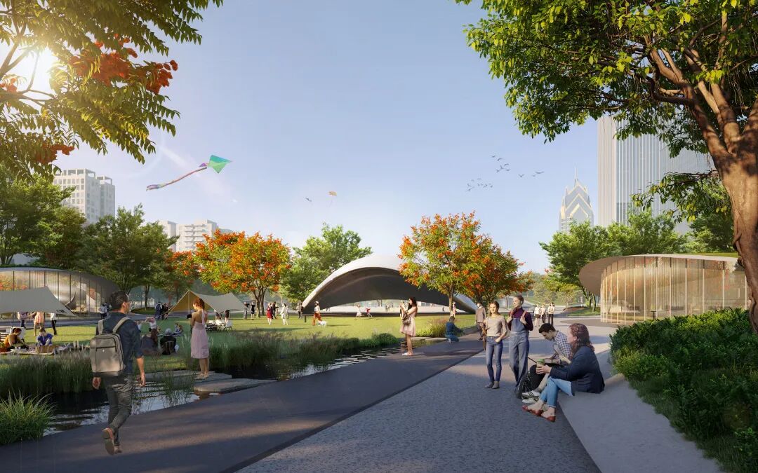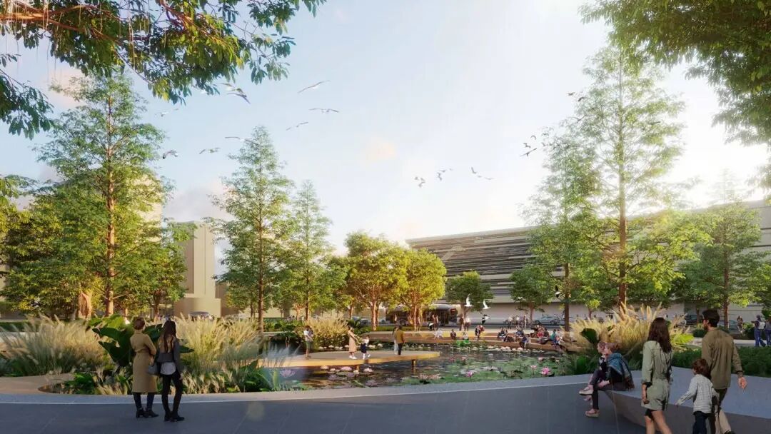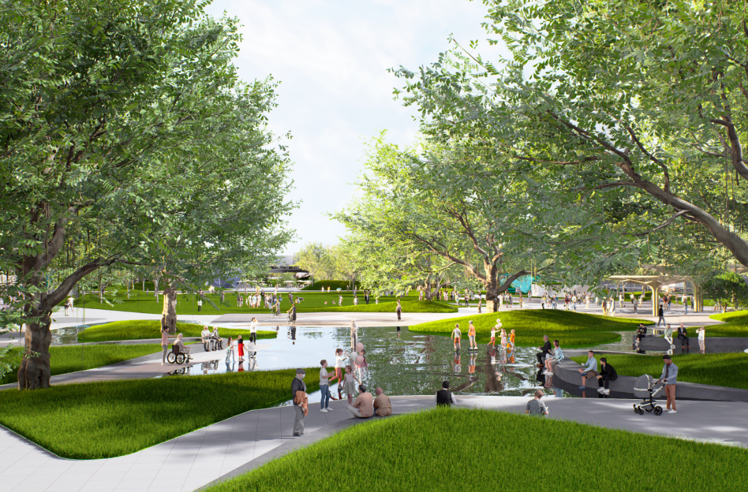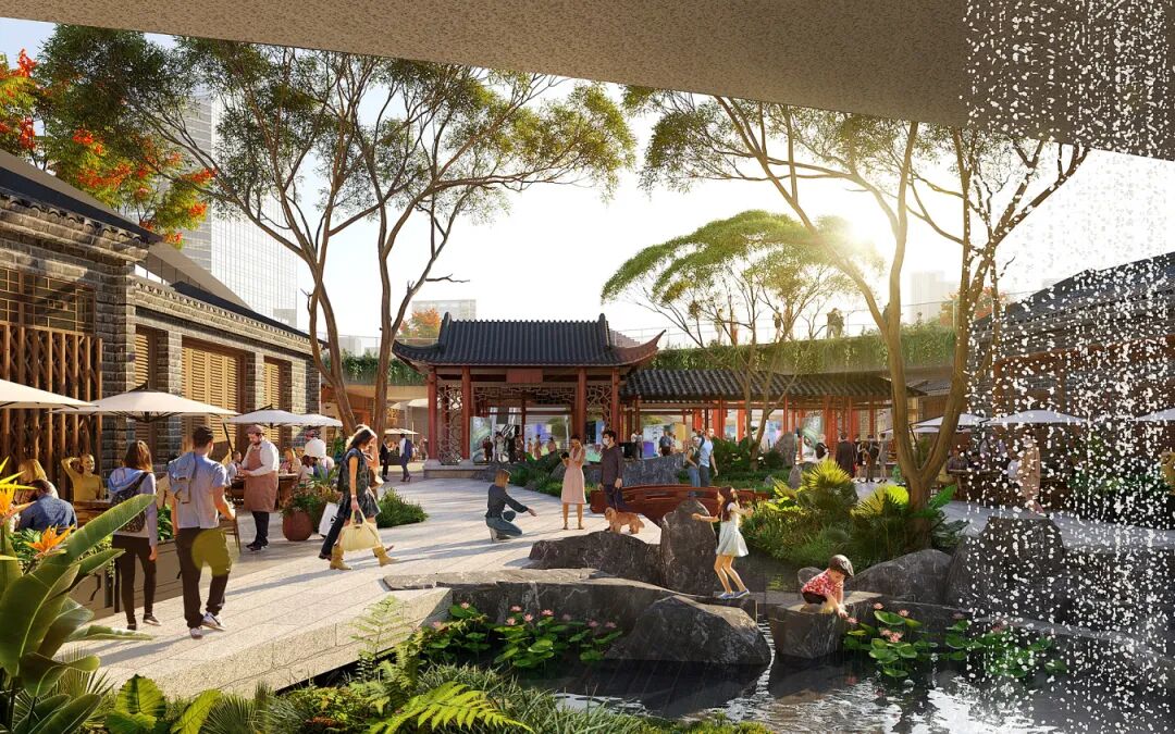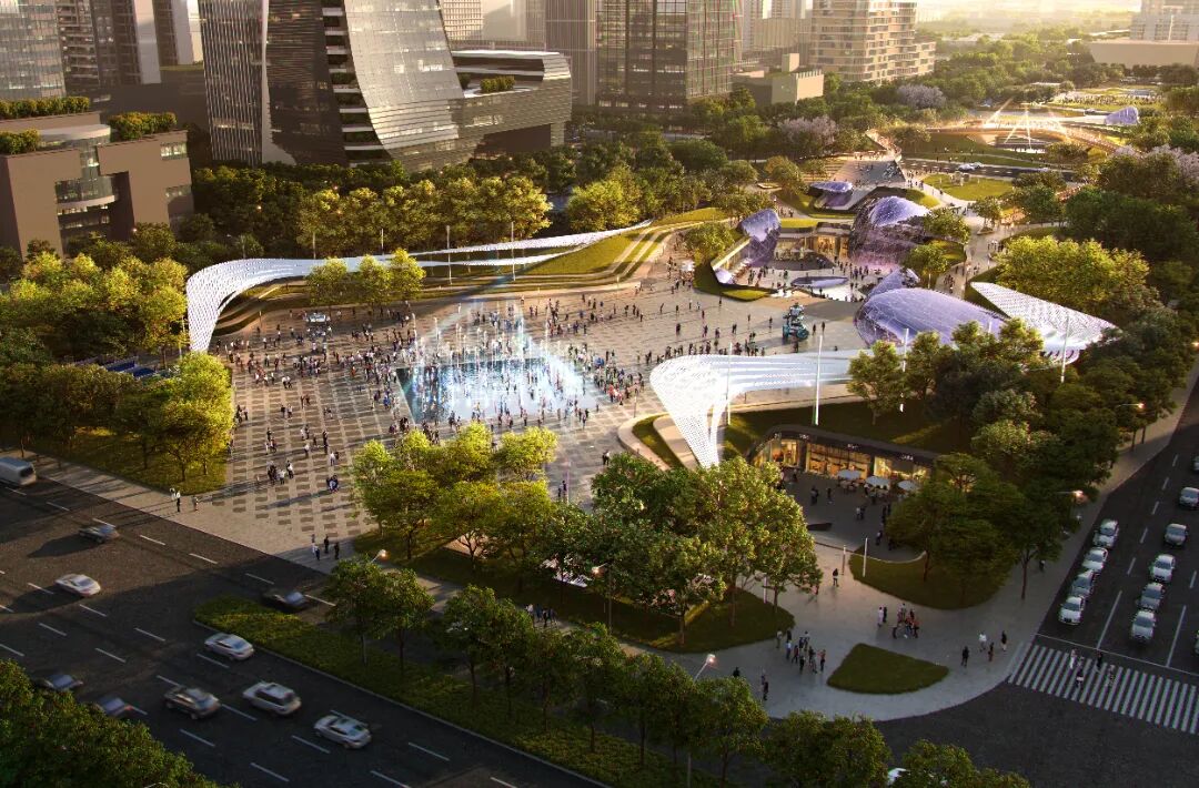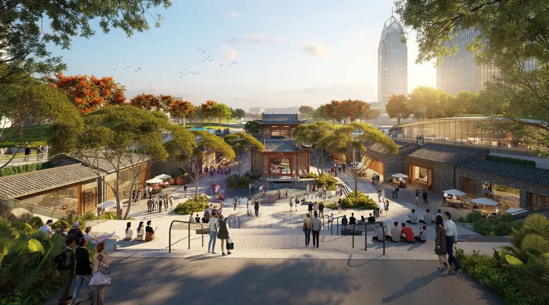 北部都市客厅:场地北门户的城市之心,都市客厅展现岭南文化与现代文化的交融,突破时光与空间的限制,创造系列开阔且具有表现力的城市公共空间。