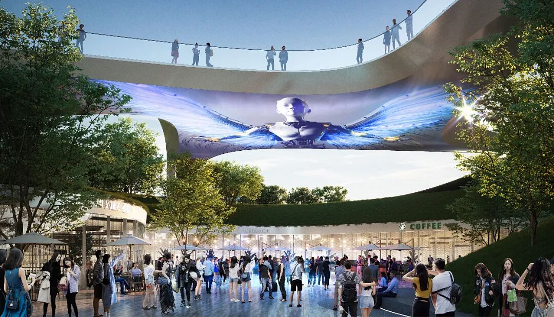 (互动科技天幕:水袖天桥中央形成空中广场,底部结合科技投影打造科幻互动天幕,一个新的城市打卡点。)
