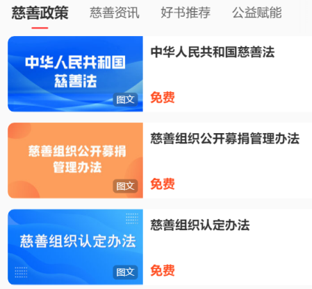 慈善网院设置“慈善政策”“慈善资讯”“好书推荐”等板块,为慈善组织及相关从业人员提供专业书籍和政策资讯的分享平台,该板块会定期梳理和集中展示一系列慈善政策、慈善资讯和相关学习资源,可以说是一个囊括了慈善政策、理论和实操工具的学习窗口,让慈善组织及相关从业人员的学习更加便利、便捷。