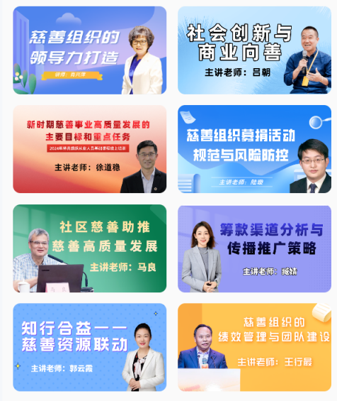 慈善组织从业人员专题班内容包括:“政策法规”“合规治理”“慈善捐赠”“筹款传播”“慈善创新”“在地服务”“人员管理”“慈善案例”等专题培训。