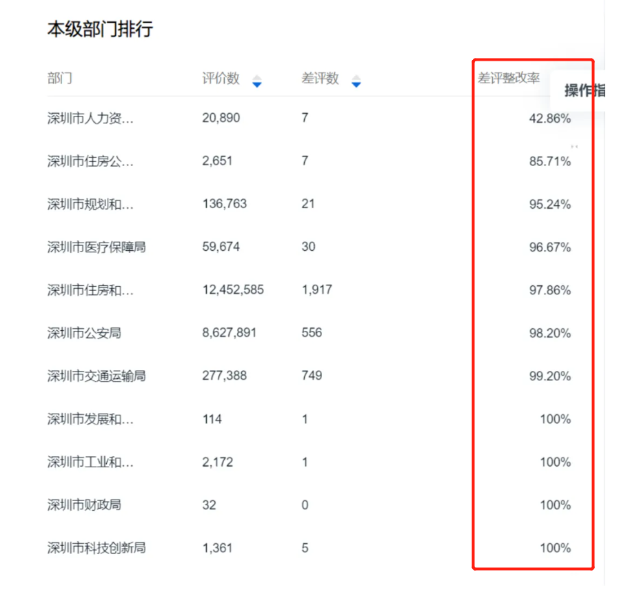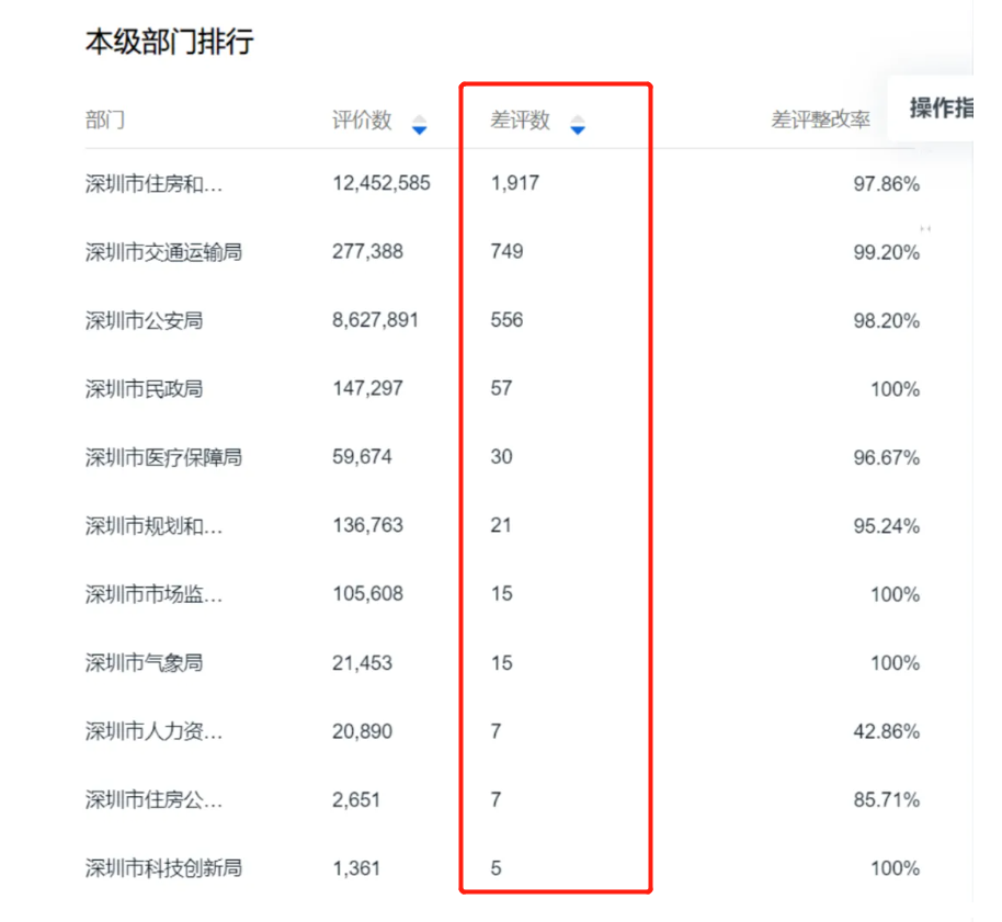 值得一提的是,综合“差评数”和“差评整改率”两项数据,记者发现,市住房和建设局不仅收到的“差评数”最多,且“差评整改率”也在深圳市本级部门排行中居于末流。此外,市人力资源和社会保障局虽只收到7条“差评”,但其“差评整改率”最低,仅有42.86%。