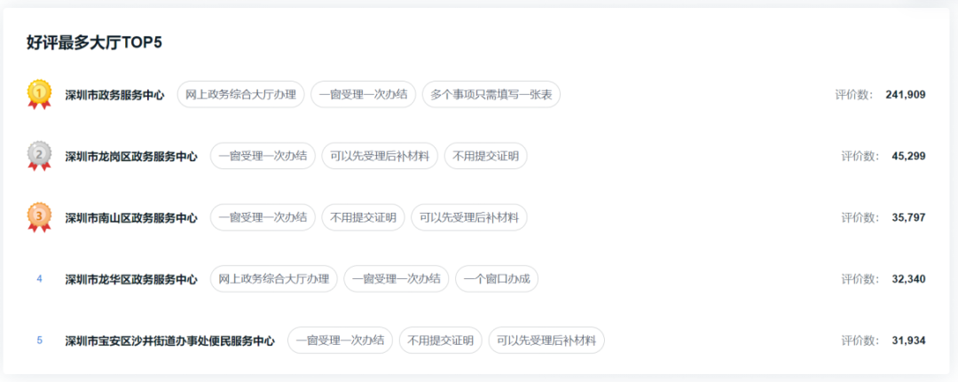 今年以来,全市收到好评最多的大厅前五名为:市政务服务中心(241,909条)、龙岗区政务服务中心(45,299条)、南山区政务服务中心(35,797条)、龙华区政务服务中心(32,340条)、宝安区沙井街道办事处便民服务中心(31,934条),群众给出的“好评关键词”包括:“一窗受理一次办结”“不用提交证明”“可以先受理后补材料”,反映出深圳市政务服务既有速度,又有温度。