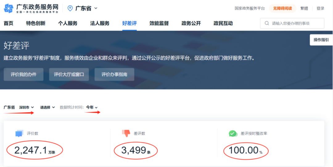 据广东政务服务网数据显示,2024年以来,深圳市政务服务各渠道收集用户评价数2,247.1万条,占广东全省收到评价数(8,152.2万条)四分之一以上。其中,差评数3499条,差评按时整改率100%。