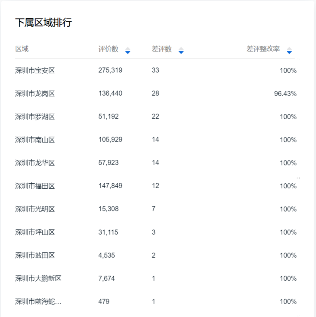 其中,各区收到的“差评数”在0-33条不等,其中,宝安区收到的“差评数”最多,为33条。从“差评整改率”来看,除福田区(92.31%)、龙岗区(96.43%)外,深圳市其他区均达到100%。以上两区还需推进政务服务“加速快跑”,全方位提升政务服务效能。